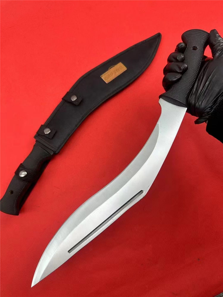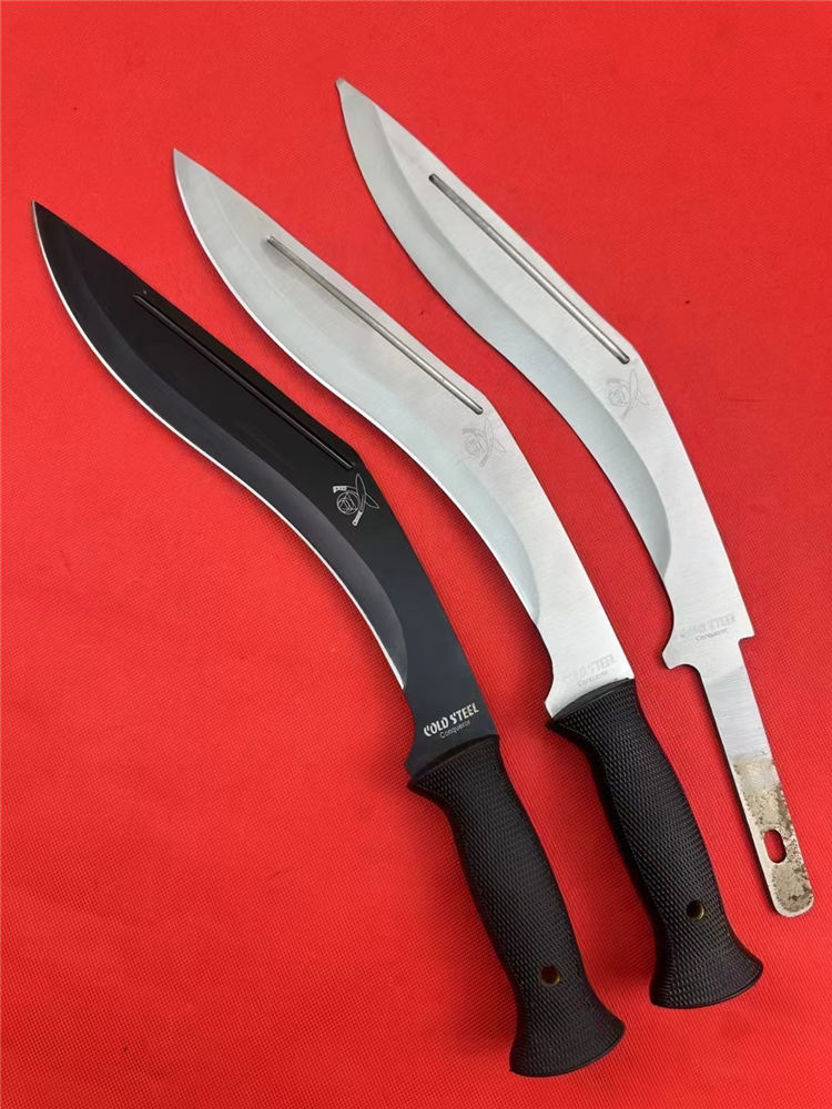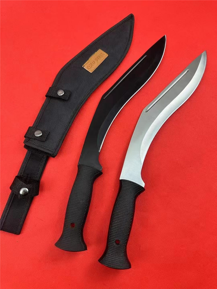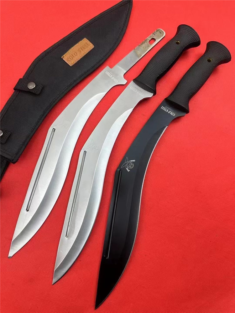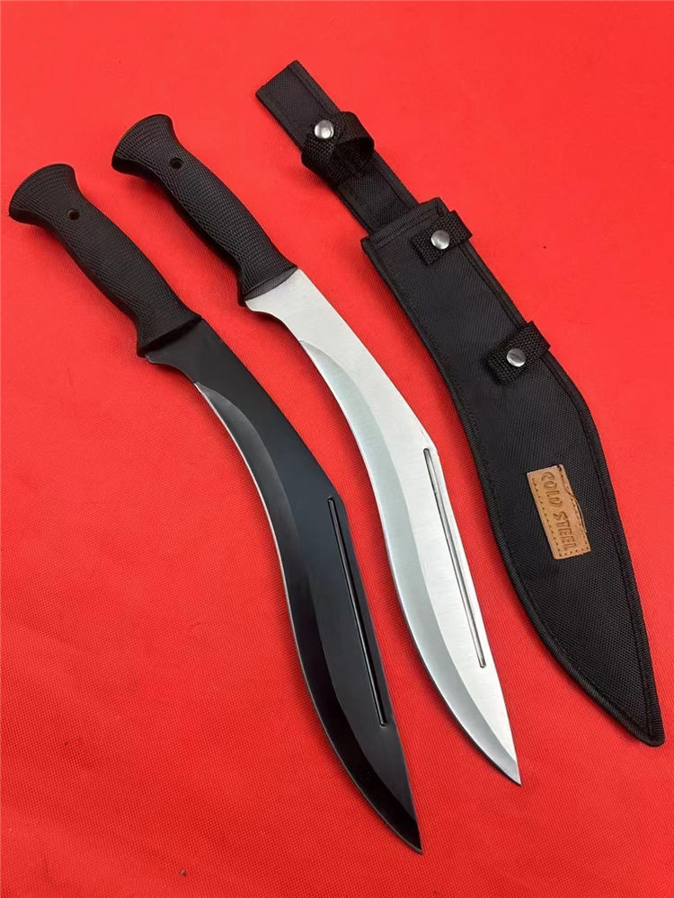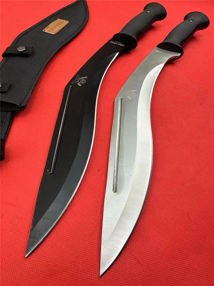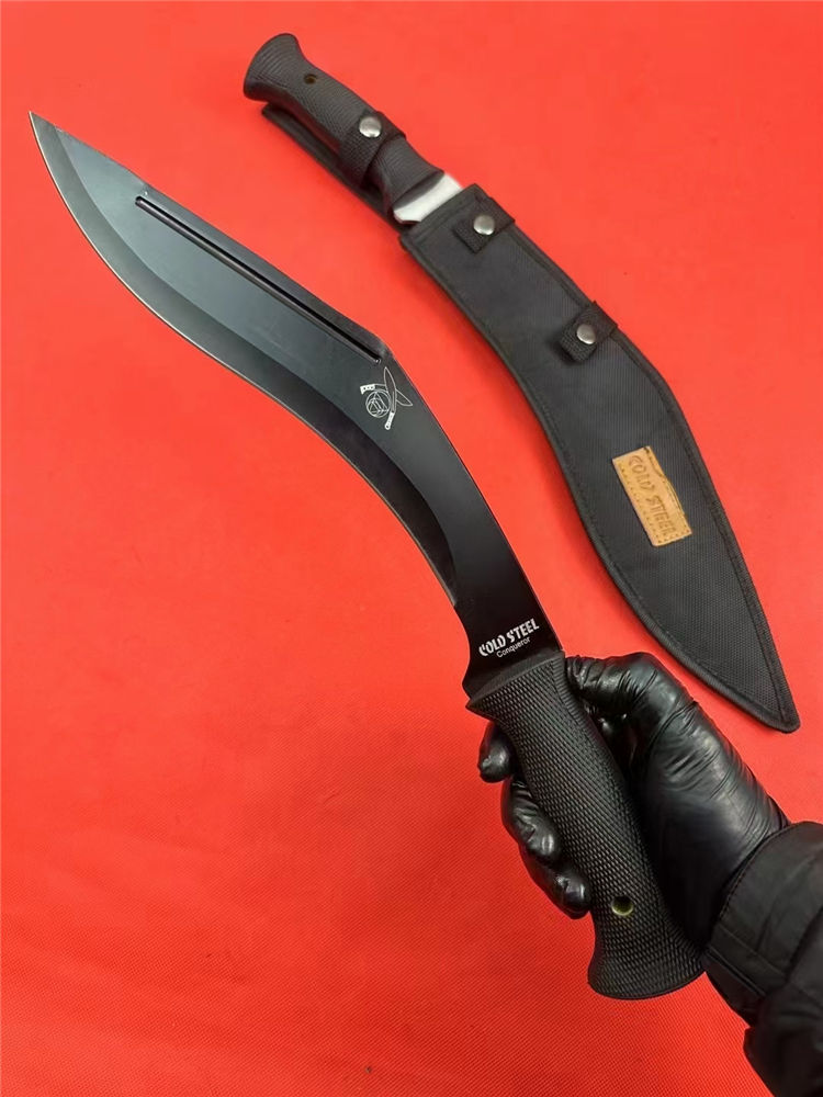一体版冷钢狗腿3号(黑色) 全 长:438mm 刃 长:290mm 柄 长:128mm 刃 宽:50mm 刃 厚:4mm 刃 材:5Cr13Mov 重 量:610g(含包装) 硬 度:56HRC 表 面:砂光和氧化黑 柄 材:ABS 锁 型:定锁 其 他:彩盒+尼龙套