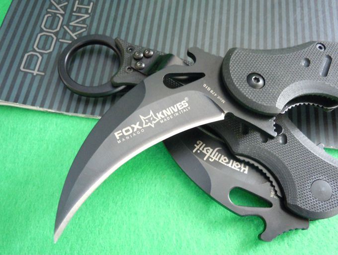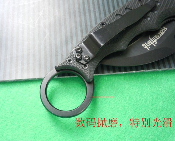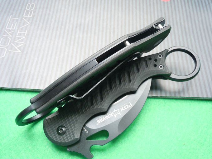 FOX(狐狸)karambit折叠鹰爪,两种打开刀刃方式,首先是具有快开钩设计,随身携带时,刀具通过口袋夹锁定在裤袋里。当您将食指插入刀柄边缘的洞孔时,随即向前从口袋中抽出。刀具大部分还挂在口袋里时,其独特的快开钩已经配合着已将刀刃迅速展开了,使得“鹰爪”离开口袋时就已经可以顺势向对手攻击。其二可以通过食指快拨打开刀刃一样轻盈快捷。进口440C刃材料,真空热处理硬度达59-60,非常锐利,轴铜衬片,使每一次打开都顺畅,转圈经电脑数码抛磨,非常适合玩爪花,是爪玩家首选精品!