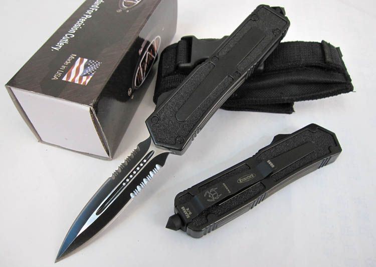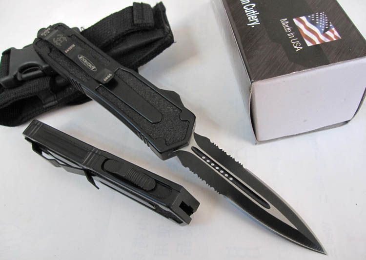 微技术.圣甲虫半齿双锋(黑色) 开启长度:22CM 合起长度:13.5CM 刃 厚:0.3CM 硬 度:57 HRC 刃 材:440c 表 面:发黑 把 手:航空铝合金+钢砂 净 重:220克(整刀) 毛 重:300克(含包装物) 开 合:双动作,直推开关,自动弹出和收回(刀头比较牢固,只有很轻微的摇动) 包 装:耐磨专用战术尼龙套。 口袋刀夹:弹簧刀夹 玻璃敲击器:钨质玻璃敲击器。