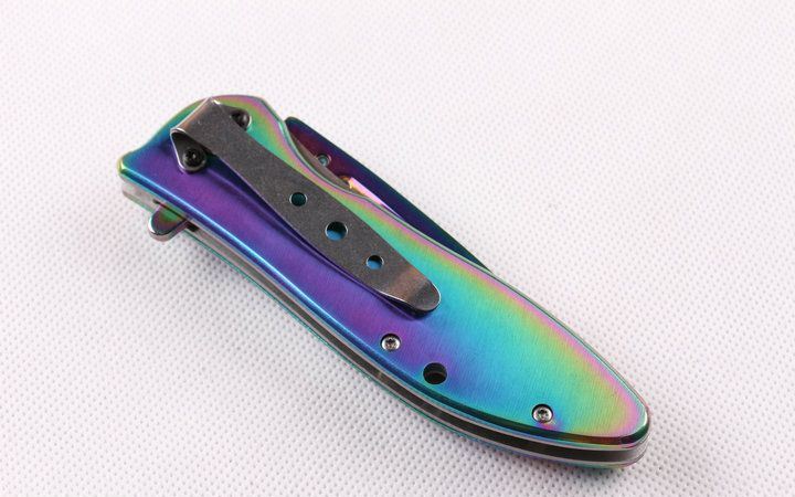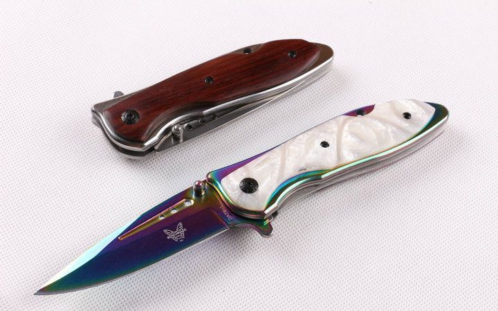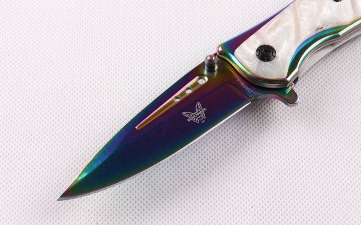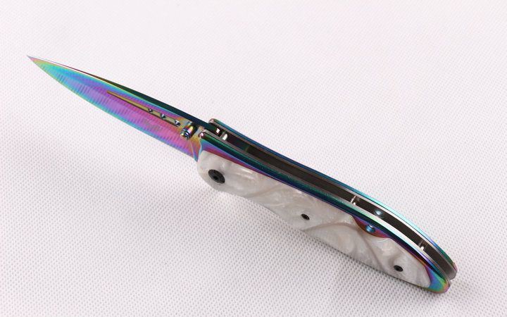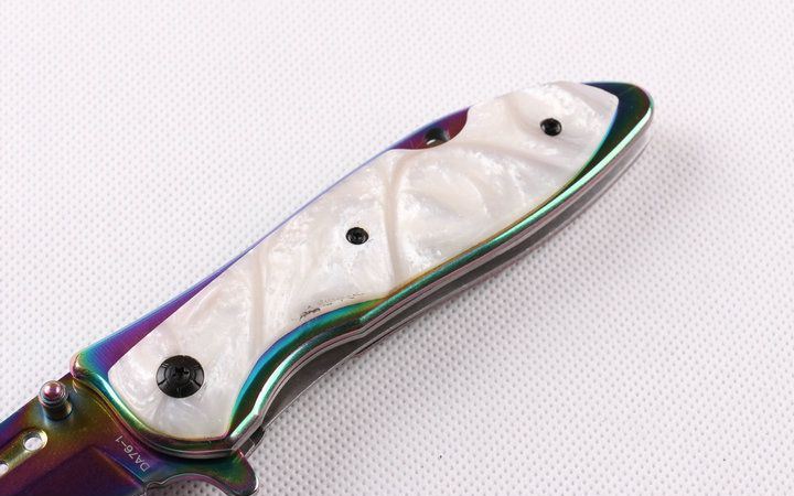 勃朗宁DA76-1快开折刀(彩钛) 全 长:20.2cm 刃 长:8.5cm 柄 长:11.6cm 刃 宽:2.6cm(最宽处) 刃 厚:2.8mm 刃 材:5CR13MOV 硬 度:56HRC 刀 柄:钢柄+仿玉柄 表 面:彩钛 重 量:200克 配原厂包装