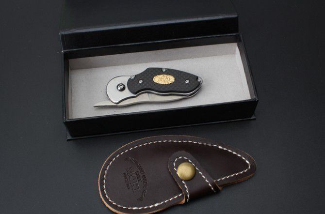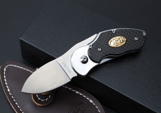 VG10碳纤MOKI肥后守折刀 全 长:138mm 刃 长:53mm 柄 长:85mm 刃 宽:25mm 刃 厚:3mm 刃 材:VG-10 重 量:189g(含包装) 硬 度:58HRC 表 面:沙光 柄 材:钢+碳纤 锁 型:线锁 其 他:配皮套+礼品盒