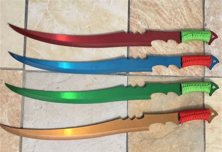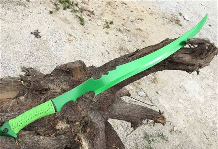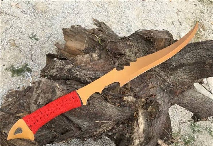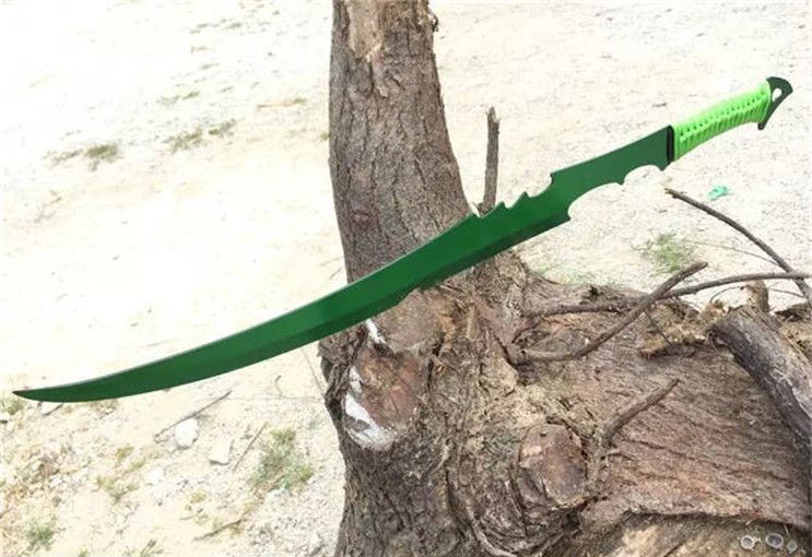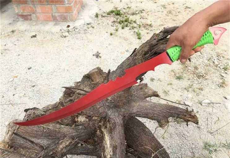 幻彩鬼刀1号 全长:63cm 刃长:35cm 柄长:22cm 刃厚:2.8mm 表面:氧化镀色 刃材:440 硬度:57HRC 刀柄:绑绳 重量:570g 备注:带尼龙刀套 包装:硬纸盒