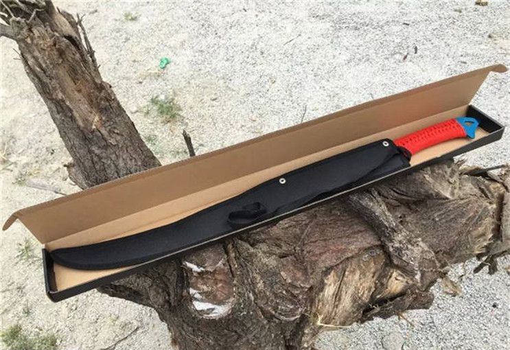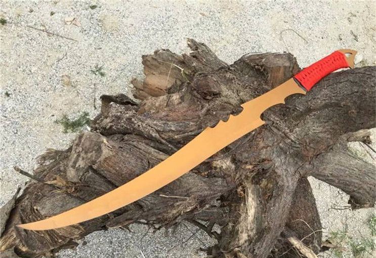 全长:63cm 刃长:35cm 柄长:22cm 刃厚:2.8mm 表面:氧化镀色 刃材:440 硬度:57HRC 刀柄:绑绳 重量:570g 备注:带尼龙刀套 包装:硬纸盒