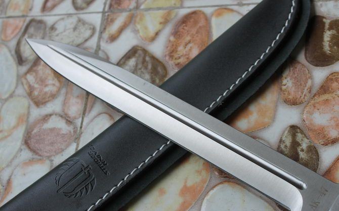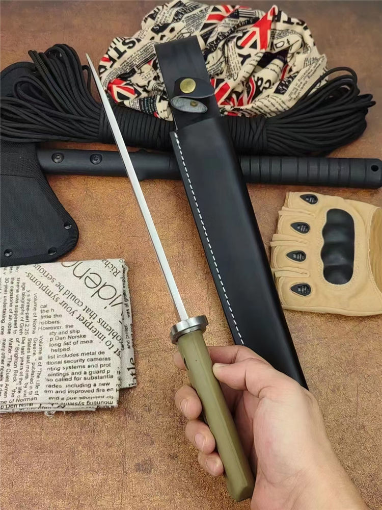 全长:39cm 刃长:26.2cm 柄长:13.6cm 刃厚:0.60cm 刃宽:2.8cm 刃材:7Cr15Mov 柄材:橡塑 硬度:58HRC 净重:422克 毛重:704克 表面处:沙光+金色 其他:配午皮套+硬纸盒