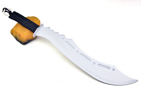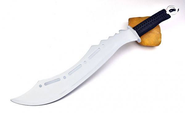 全长:60cm 刃长:40.cm 刃厚:3mm 柄长:18cm 硬度: 56 刃材:420不锈钢 柄材:绑绳 包装;尼龙刀鞘 重量:650克 表面: 沙光