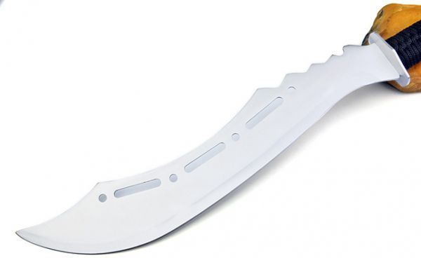 银蛇郎君大弯刀 全长:60cm 刃长:40.cm 刃厚:3mm 柄长:18cm 硬度: 56 刃材:420不锈钢 柄材:绑绳 包装;尼龙刀鞘 重量:650克 表面: 沙光