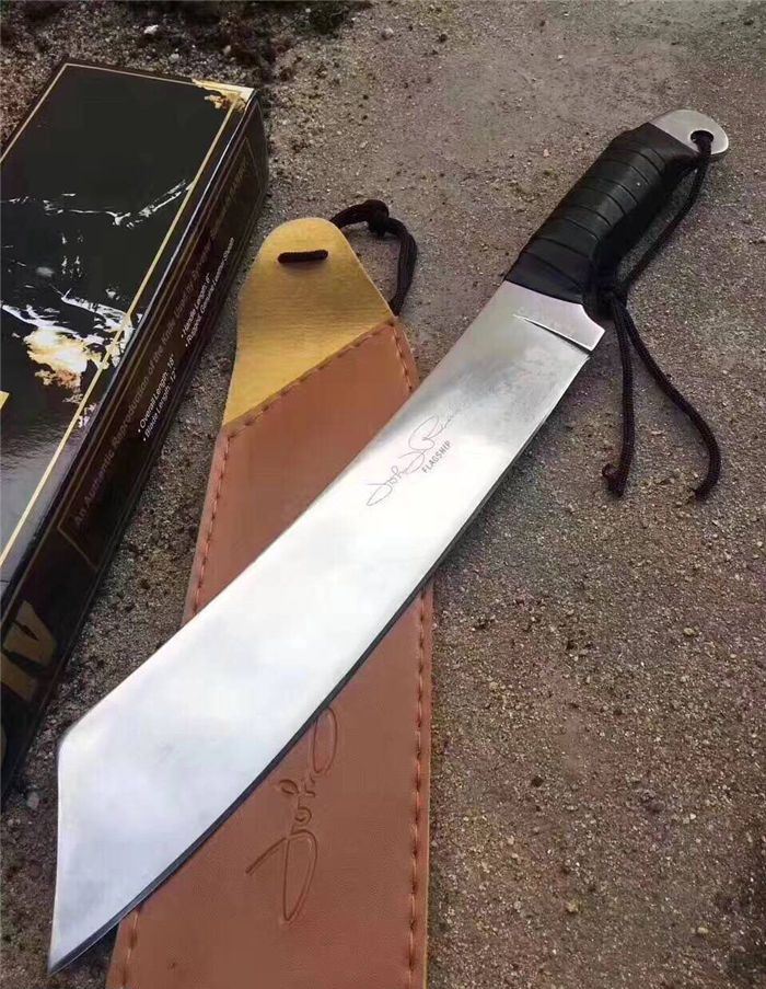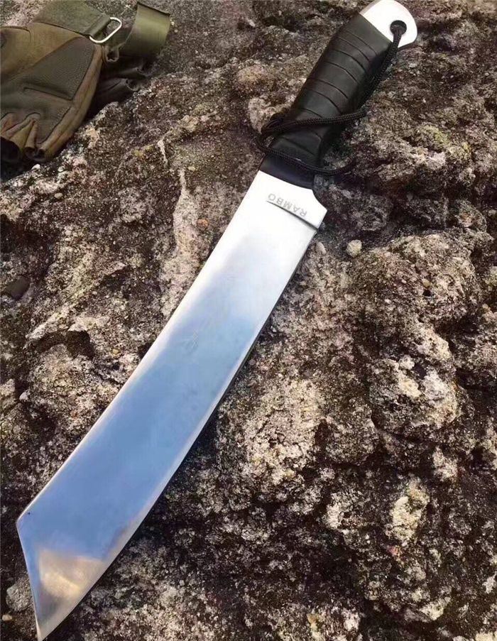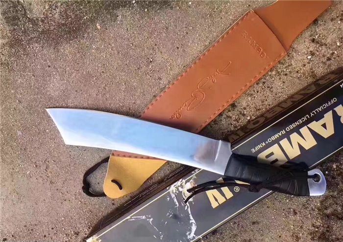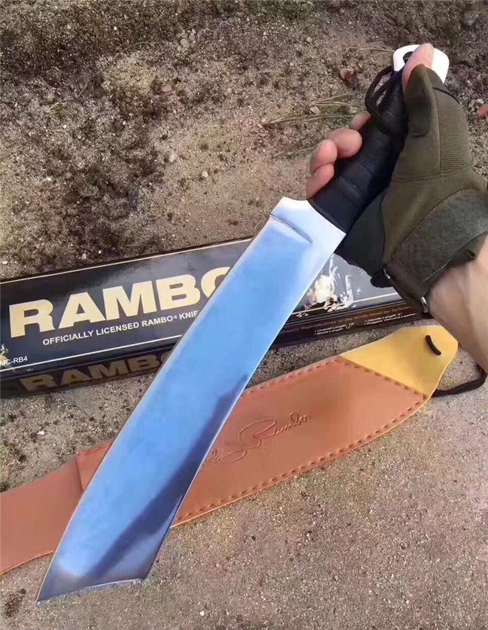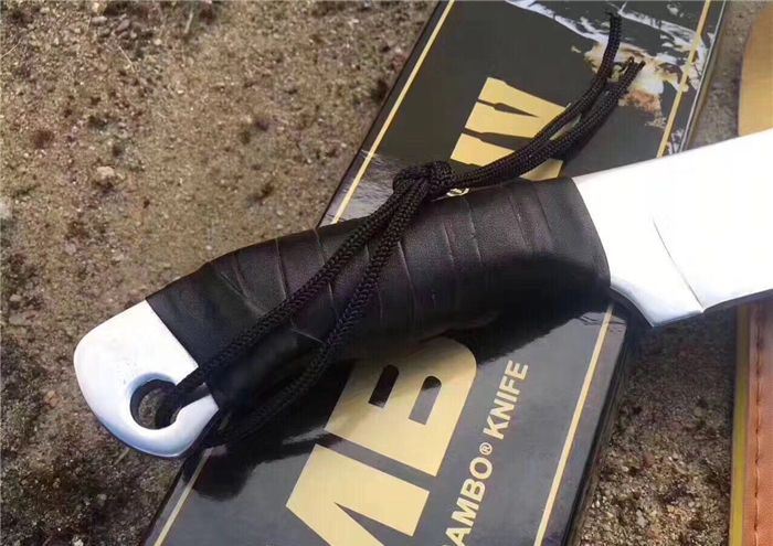 兰博4号手签纪念版(白) 全 长:420mm 刃 长:245mm 柄 长:135mm 刃 宽:62mm 刃 厚:5.5mm 刃 材:3Cr13Mov 重 量:760g(含包装) 硬 度:55HRC 表 面:镜面 柄 材:黑皮绳 其 他:配彩盒和人革皮套