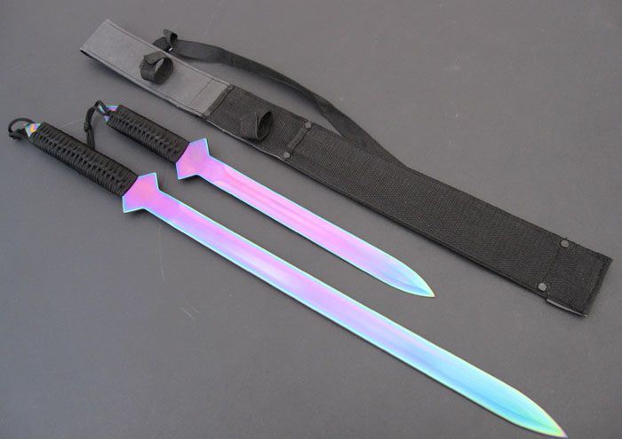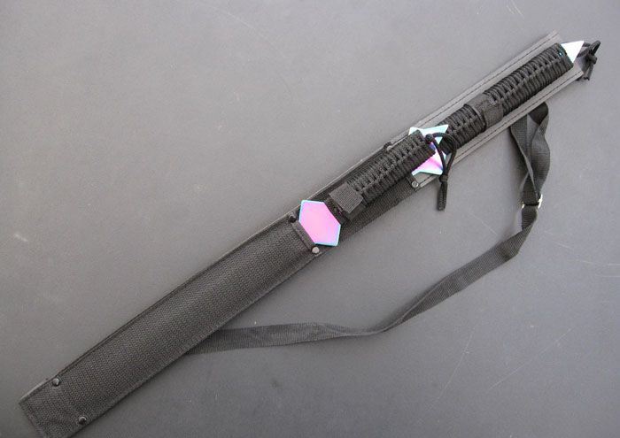 烈焰忍者双剑 短刀 全长:44.5cm 刃长:27.5cm 柄长:14cm 厚度:0.28cm 重量:220克 长刀 全长:66cm 刃长:44cm 柄长:19cm 厚度:0.28cm 重量:340克 藏刀后整套长:67CM 总重量:650克 刃材:420 硬度:56 表面处理:彩钛 两边开锋 配战术尼龙刀鞘 刀柄用黑扎带人工绕扎而成,刀鞘可将双刀合二为一