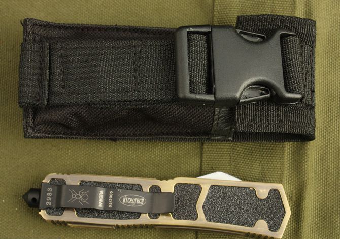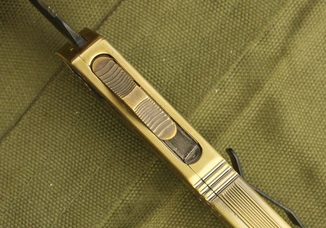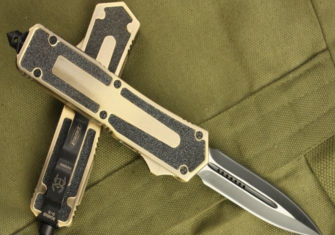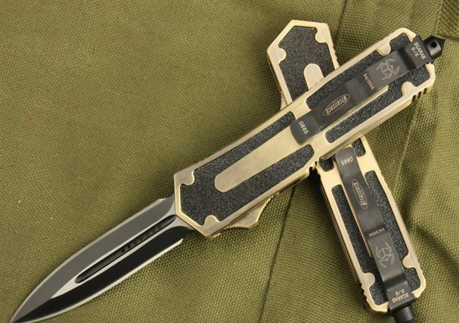 微技术.圣甲虫全刃双锋(金色) 开启长度:22CM 合起长度:13.5CM 刃 厚:0.3CM 硬 度:57 HRC 刃 材:440c 表 面:发黑 把 手:航空铝合金+钢砂 净 重:220克(整刀) 毛 重:300克(含包装物) 开 合:双动作,直推开关,自动弹出和收回(刀头比较牢固,只有很轻微的摇动) 包 装:耐磨专用战术尼龙套。 口袋刀夹:弹簧刀夹 玻璃敲击器:钨质玻璃敲击器。