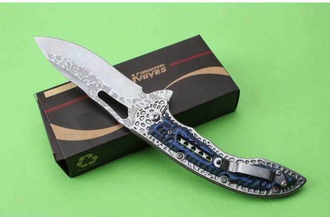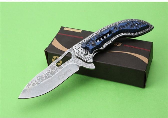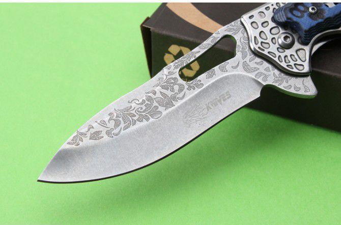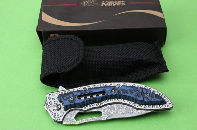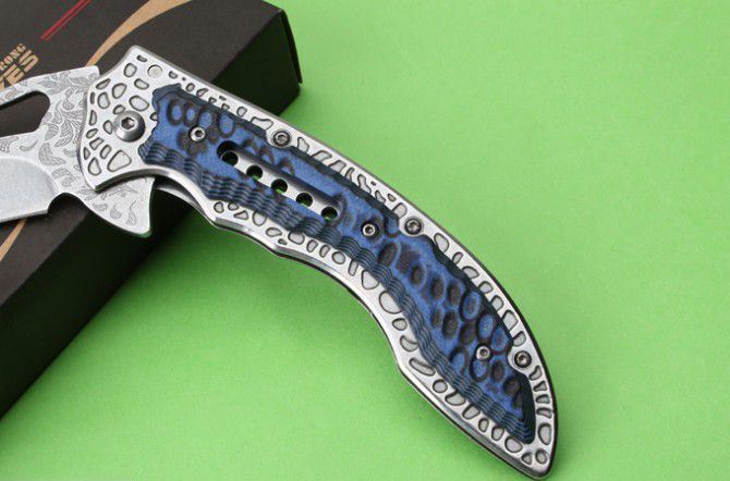 SR-638DE高端轴承快开折刀 全 长:230mm 刃 长:93mm 柄 长:133mm 刃 宽:32mm 刃 厚:3.1mm 刃 材:7Cr17Mov 重 量:176g(含包装) 硬 度:57HRC 表 面:雕花 柄 材:钢柄+双色G10 锁 型:边锁 其 他:配彩盒