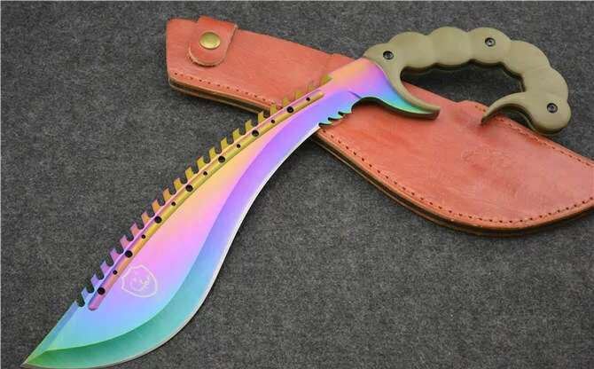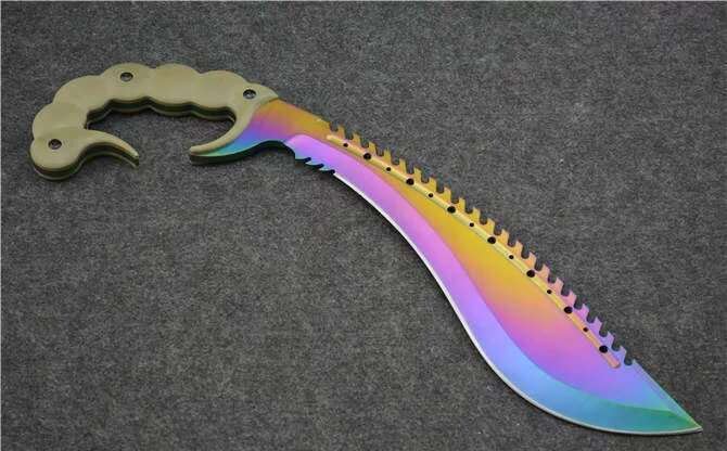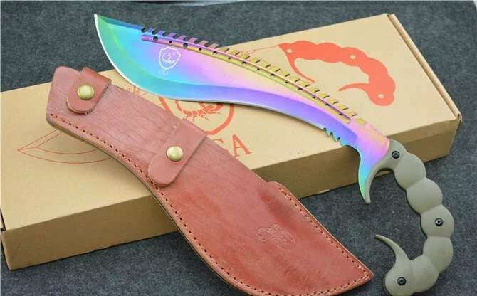 彩钛蝎子战斗狗腿刀 全 长:470mm 刃 长:300mm 柄 长:170mm刃 最宽:70mm 刃 厚:6mm 刃 材:8cr18mov净 重:1000克毛 重 :1500克(含包装) 硬 度:59HRC 表 面:镀幻钛金 柄 材:钢一体柄+G10 魔蝎战刀,大型狗腿弯刀款,仿生毒蝎尾刺手柄,握感舒适,大力劈砍可以防脱手