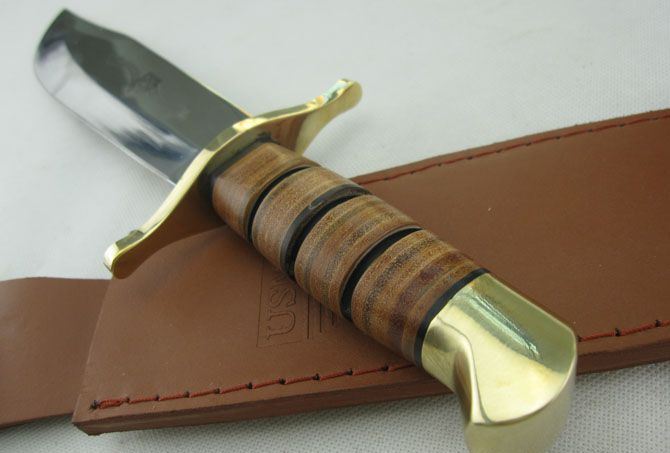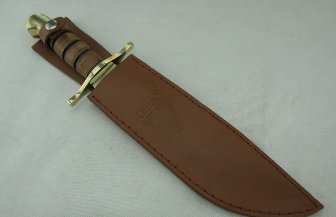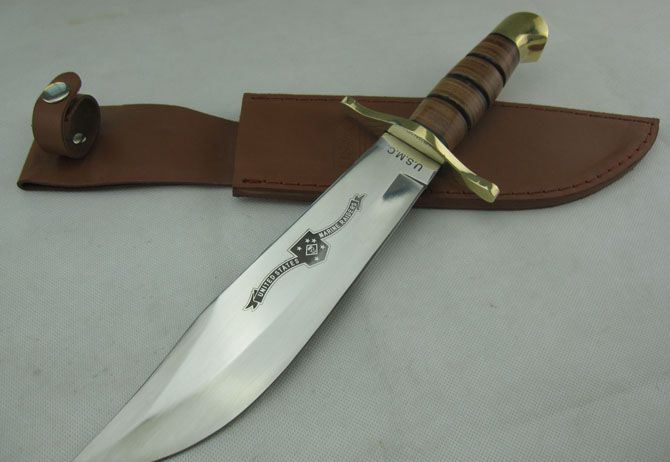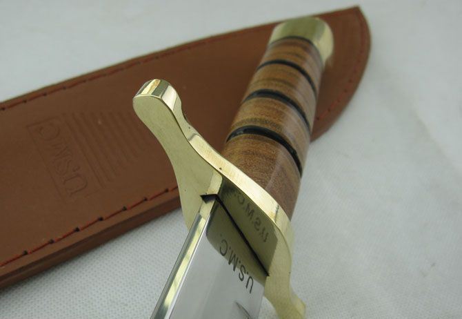 勃朗宁U.S.M.C.海军突击者直刀 全 长:36.0cm 刃 长:22.0cm 柄 长: 12.5cm 刃 宽:5.0cm(最宽处) 刃 厚:4.8mm 刃 材:440不锈钢 硬 度:58HRC 刀 柄:皮柄+铜刀挡 表 面:镜光 重 量: 660.0克 备 注: 带真皮套