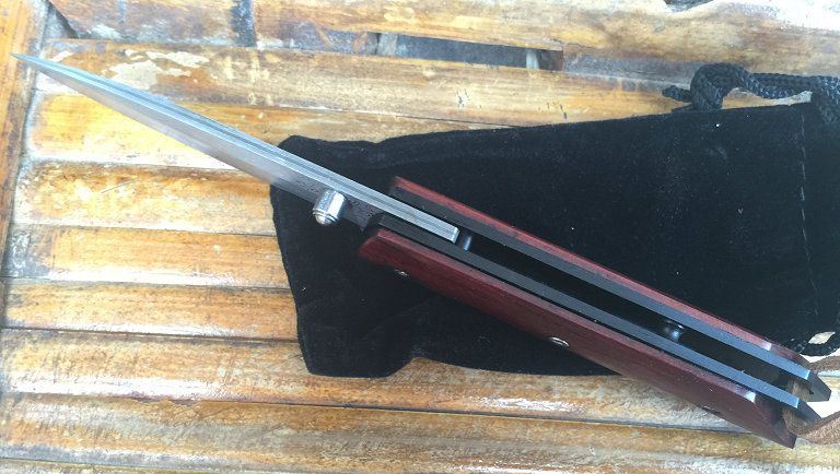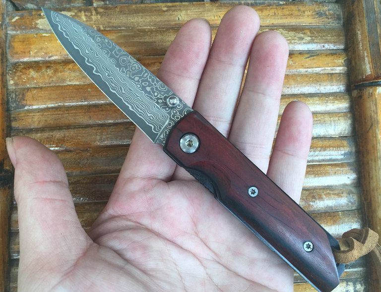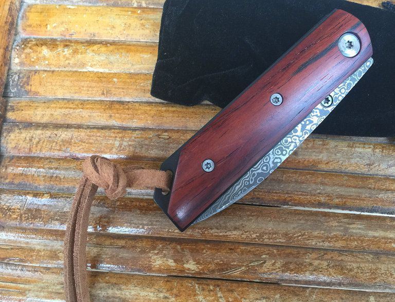 小红鸟大马士革折刀 全 长: 15.5cm 刃 长: 6.9cm 柄 长: 8.6cm 刃 宽: 1.9cm(最宽处) 硬 度: 60HRC 刃 厚: 0.25cm 柄 材: 微凹黄檀柄 重 量: 100克(含刀套) 刃 材: 进口大马士革钢 其 他: 刃口锋利 大马士革钢花纹和把手木纹及颜色各异,以实物为准!