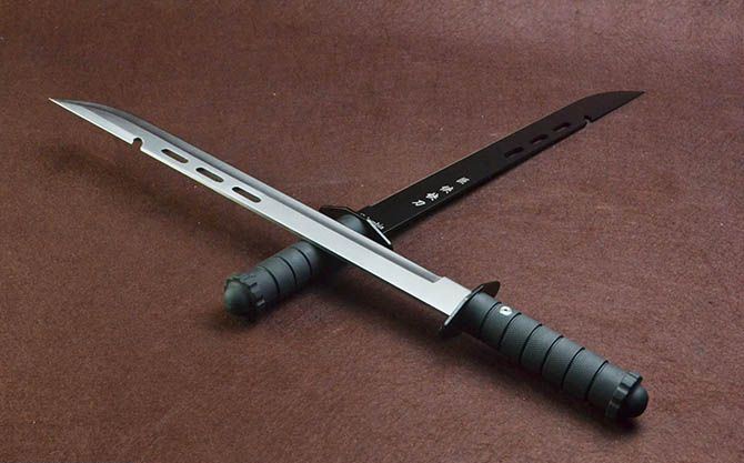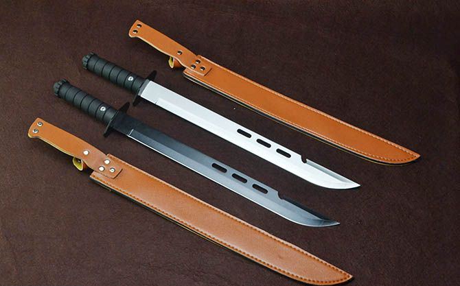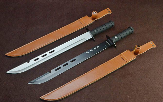 巨侠快刀(黑、白) 全 长:50.5cm 刃 长:35cm 柄 长:12cm 刃 宽:3.2cm 刃 厚:3mm 刃 材:3Cr13Mov 重 量:350g(含包装) 硬 度:56HRC 表 面:砂光/发黑 柄 材:橡塑 其 他:配皮套