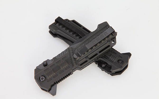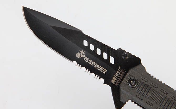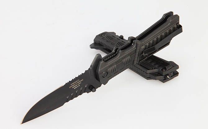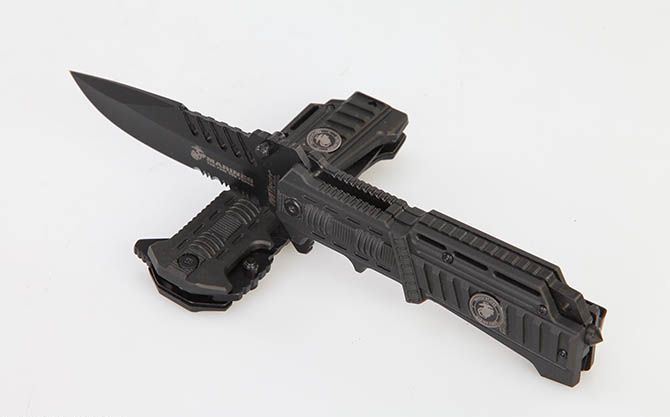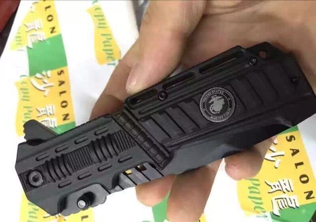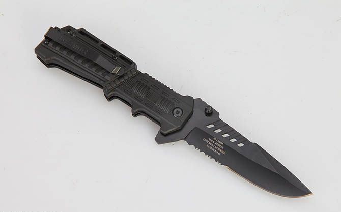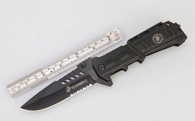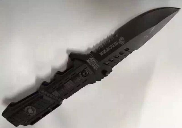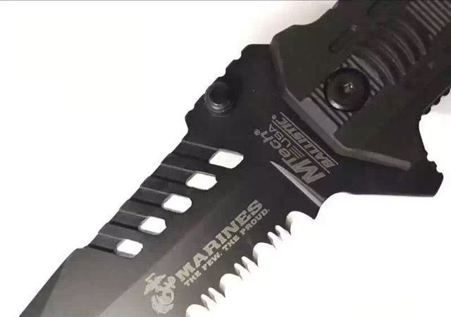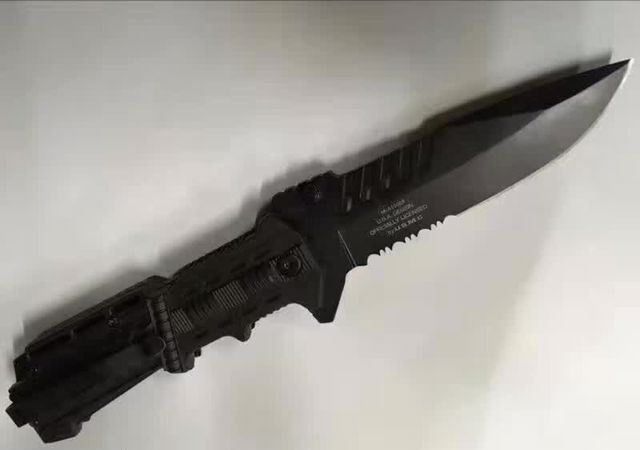 MT勇者战术折刀 全 长:23.8cm 刃 长:9.5cm 刃 宽:3.5cm(最宽处) 柄 长:13cm 刃 厚:3.6mm 刃 材:440 柄 材:尼龙玻纤 硬 度:55HRC 表 面:发黑 重 量:232克(含包装) 锁 定: 线锁 备 注:带腰夹