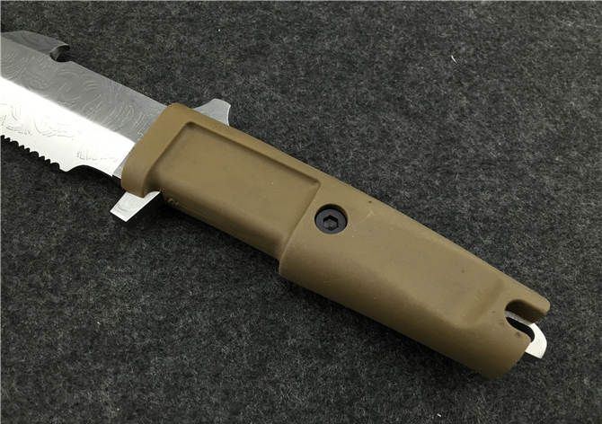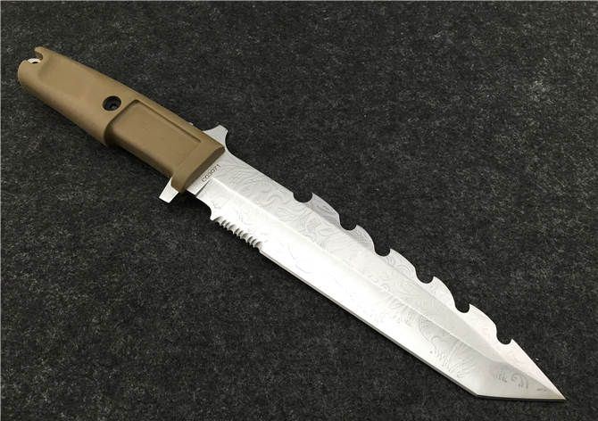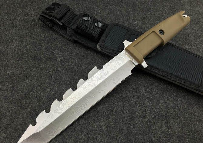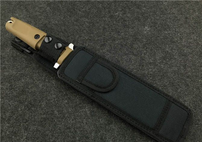 全 长: 31cm 刃 长: 18cm 刃 厚: 6mm 刃 材: 7CR13MOV 硬 度: 58HRC 表 面: 腐蚀 柄 材: ABS 刀 鞘: 尼龙(可绑腿)