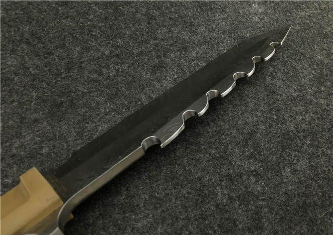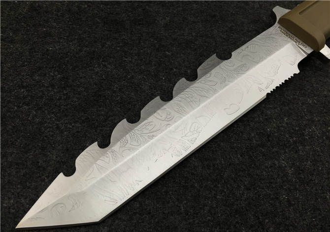 极端武力虎牙捕鲸叉(雕花) 全 长: 31cm 刃 长: 18cm 刃 厚: 6mm 刃 材: 7CR13MOV 硬 度: 58HRC 表 面: 腐蚀 柄 材: ABS 刀 鞘: 尼龙(可绑腿)