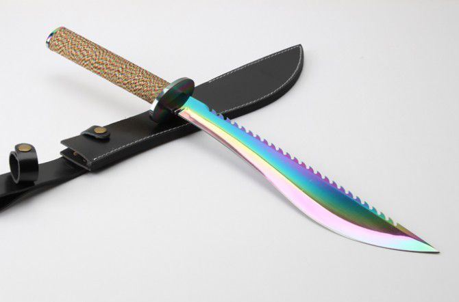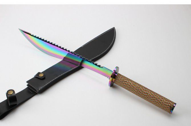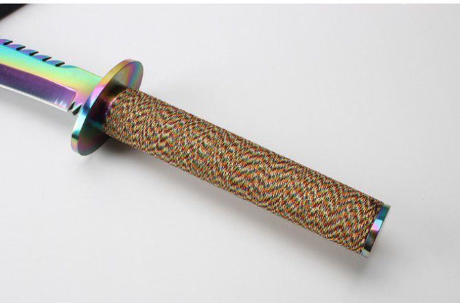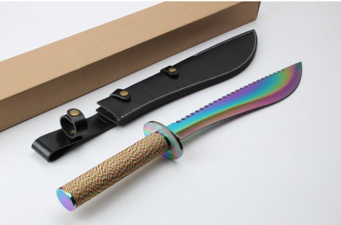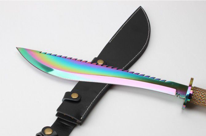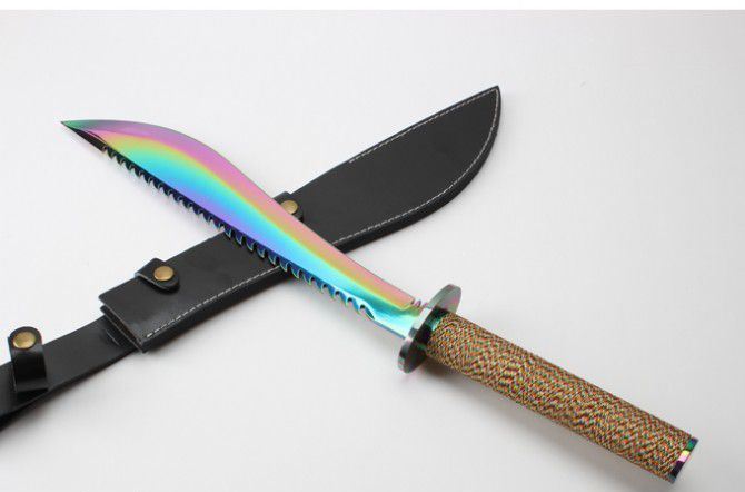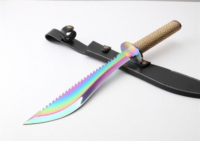 明朝捕头大刀(彩钛版) 全 长: 60.6cm 刃 长: 39.5cm 柄 长; 20.9cm 刃 厚: 5.5mm 刃 宽: 6.1cm(最宽处) 刃 材: 420 硬 度: 57HRC 刀 重: 1426克(含包装) 表 面: 彩钛 柄 材: 钢+檀木 结 构: 一体龙骨 刀 鞘: 牛皮套 +纸盒