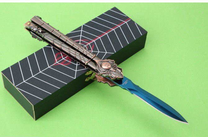 29蜘蛛黑寡妇甩刀(蓝钛版) 全 长:224mm 刃 长:68mm 柄 长:140mm 刃 宽:15mm 刃 厚:2mm 刃 材:440C 重 量:210g(含包装) 硬 度:57HRC 表 面:蓝钛 柄 材:铸钢 锁 型:甩刀 其 他:配高档木盒