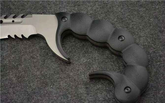 全 长:470mm 刃 长:300mm 柄 长:170mm刃 最宽:70mm 刃 厚:6mm 刃 材:8cr18mov净 重:1000克毛 重 :1500克(含包装) 硬 度:59HRC 表 面:灰钛 柄 材:钢一体柄+G10 魔蝎战刀,大型狗腿弯刀款,仿生毒蝎尾刺手柄,握感舒适,大力劈砍可以防脱手