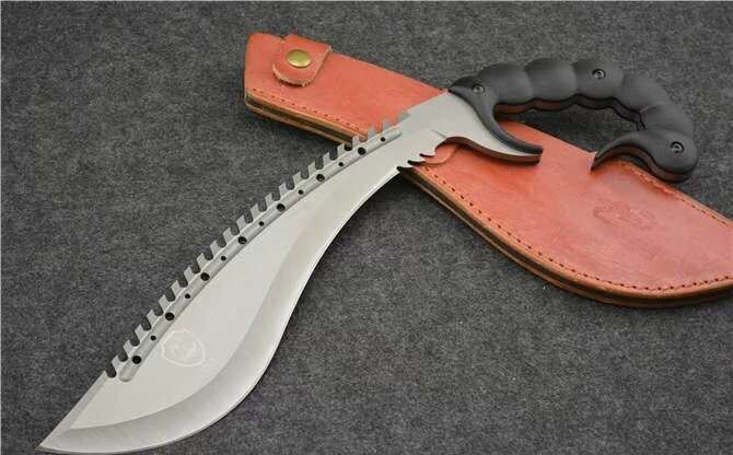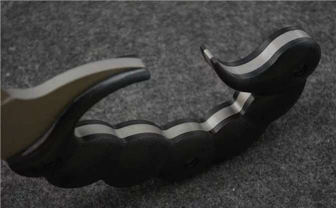 灰钛蝎子王战斗狗腿刀 全 长:470mm 刃 长:300mm 柄 长:170mm刃 最宽:70mm 刃 厚:6mm 刃 材:8cr18mov净 重:1000克毛 重 :1500克(含包装) 硬 度:59HRC 表 面:灰钛 柄 材:钢一体柄+G10 魔蝎战刀,大型狗腿弯刀款,仿生毒蝎尾刺手柄,握感舒适,大力劈砍可以防脱手