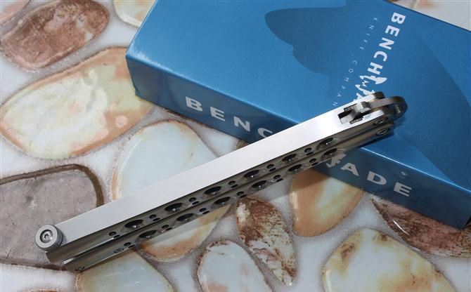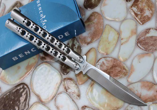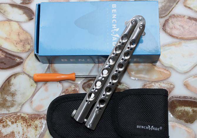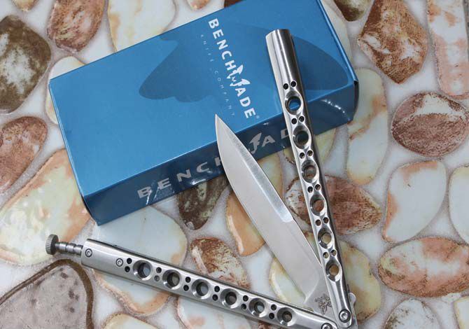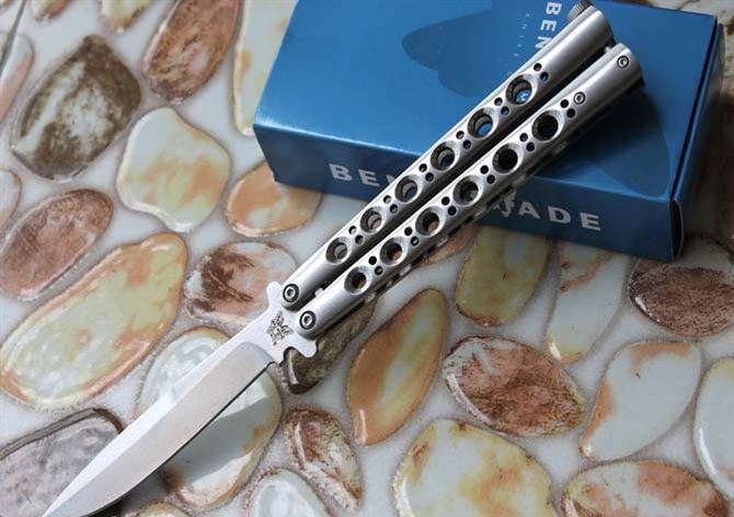 经典蝴蝶甩刀BM42(全刃) 全长:24CM(打开) 刃长:9.5CM 刃厚:0.3CM 刃材料:进口440C 硬度:59-60 重量:150克 刀鞘:刺绣尼龙刀鞘 铸钢柄镂空,压弹出刀 包装:Benchmade高级纸盒