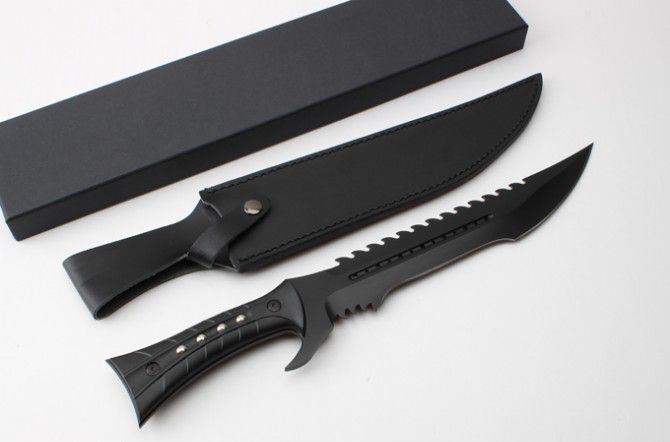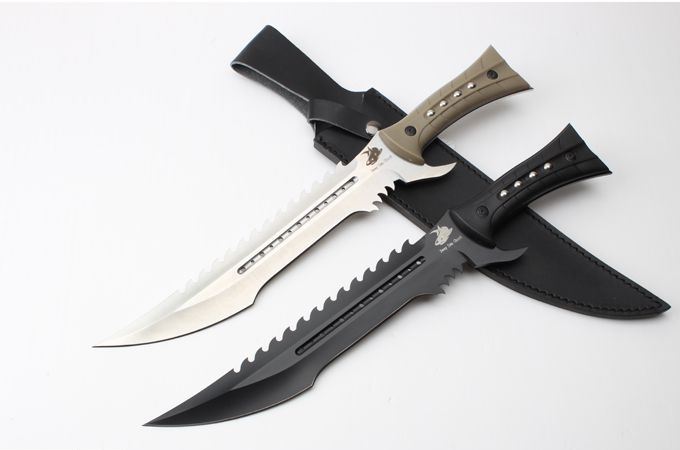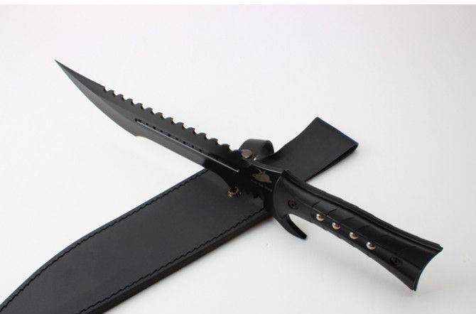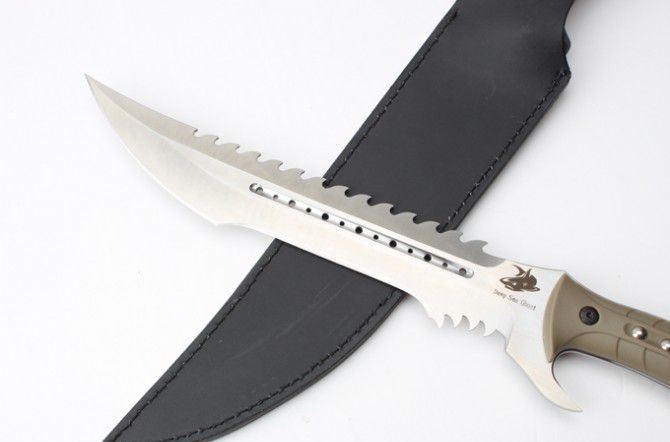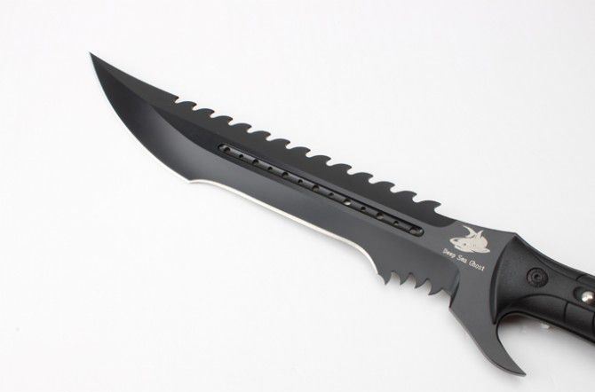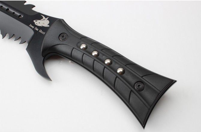 海底幽灵大白鲨刀(黑色、砂光) 全 长:44.1mm 刃 长:290mm 柄 长:142mm 刃 宽:4.9mm 刃 厚:4.8mm 刃 材:7Cr17Mov 重 量:1108g(含包装) 硬 度:57HRC 表 面:黑钛-沙光 柄 材:ABS 锁 型:定锁 其 他:配尼套和硬纸盒