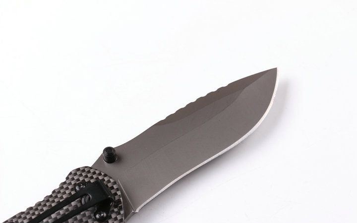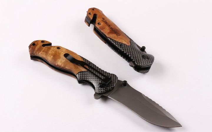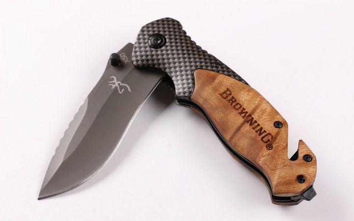 勃朗宁X50快开折刀 全 长:20.2cm 刃 长:8.3cm 刃 宽:2.8cm(最宽处) 刃 厚:2.9mm 柄 长:12.1cm 表 面: 镀灰钛 刃 材: 440C 硬 度: 57HRC 柄 材: 钢片+碳纤纹钢头+红影木 重 量: 150克(含彩盒子) 锁 闭:线锁 备 注:带腰夹和内置一字批