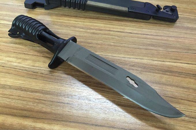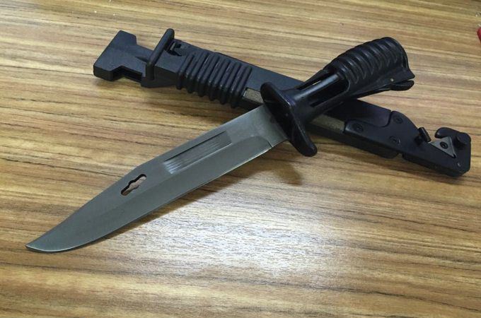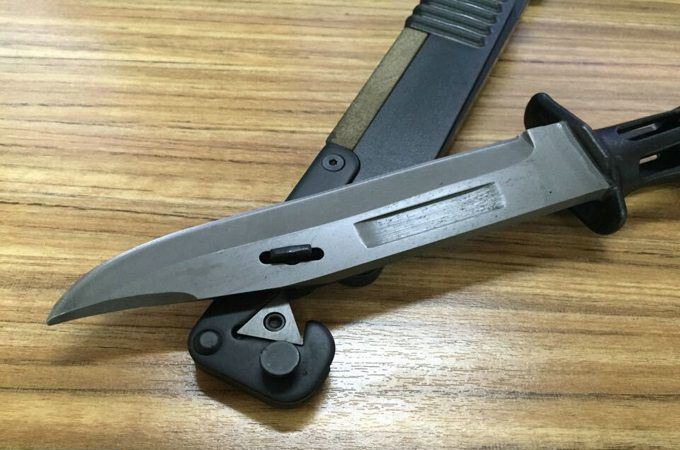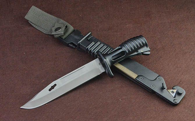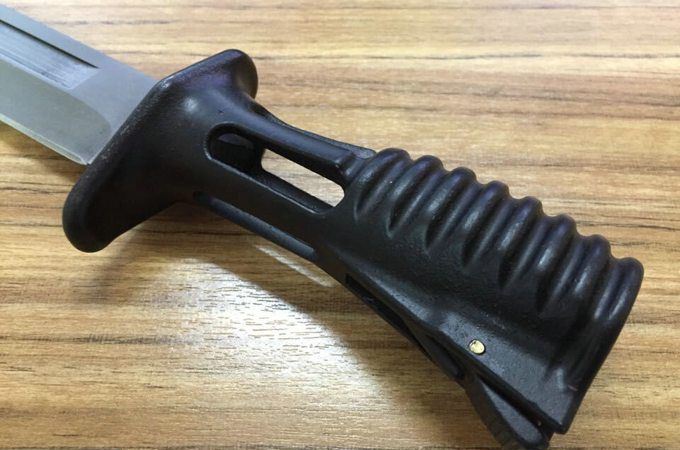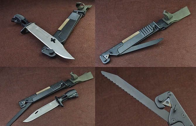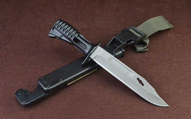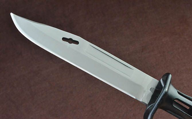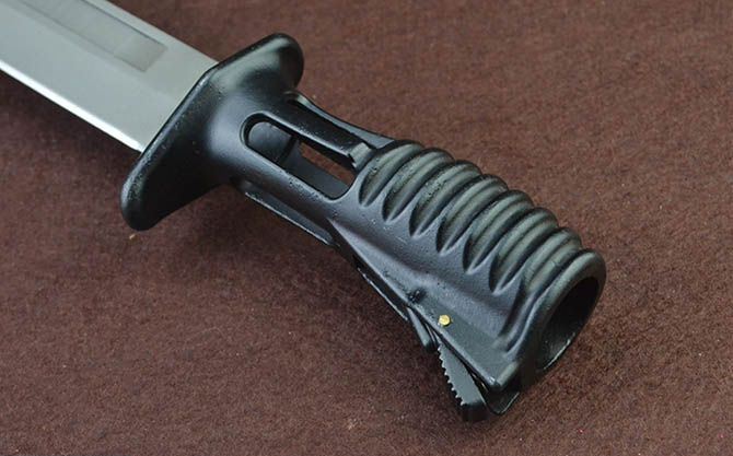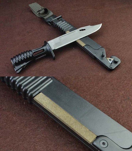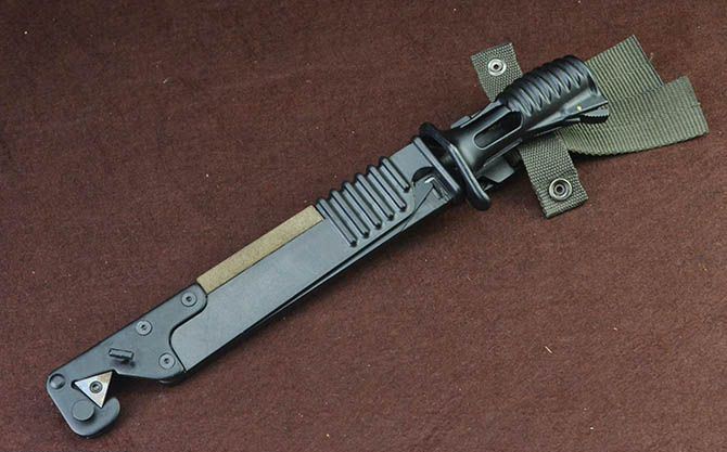 德国多用途军刺 全 长: 28.3cm 刃 长: 16cm 刃 宽: 3.2cm(最宽处) 柄 长: 10.3cm 刃 材: 7cr17 硬 度: 58 表 面: 喷砂 刃 厚: 0.72cm 柄 材: 全钢挖空柄 重 量: 800克 其 他:战术刀鞘(含有锯片,磨刀石),顶端三角合金钢可以配合刀背形成战术大力剪