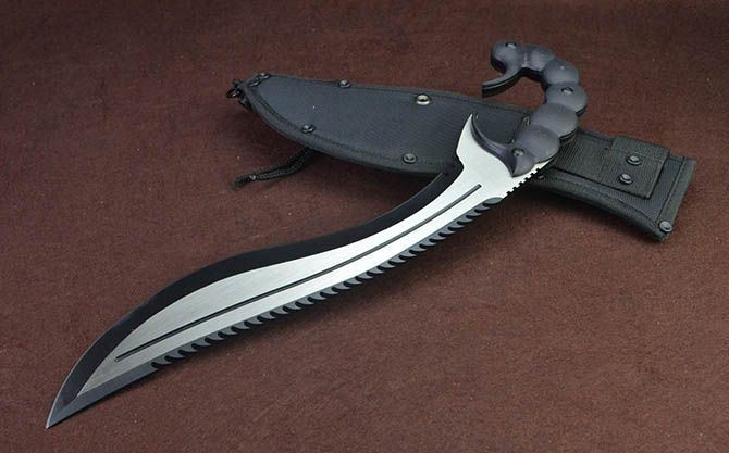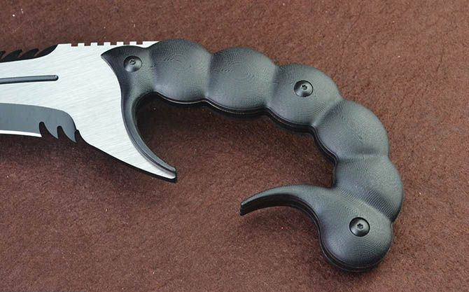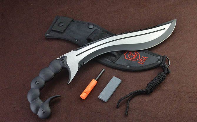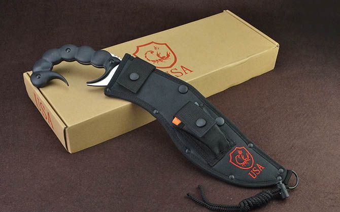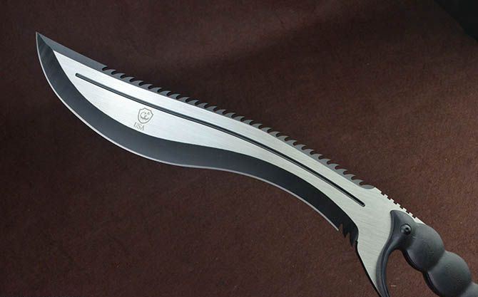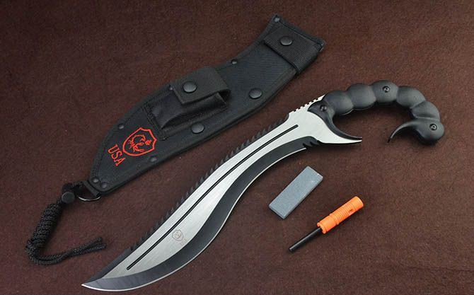 毁灭者蝎子王狗腿刀(拉丝) 全 长:43cm 刃 长:28cm 柄 长:15.5cm 刃最宽:5.7cm 刃 厚:4.5cm 刃 材:7cr17mov 毛 重:1050克(含包装) 硬 度:59HRC 表 面:黑钛+拉丝 柄 材:钢一体柄+G10柄 其 他:配尼龙套和磨刀石1个,打火镁条1支,USA代工版