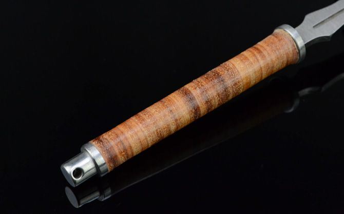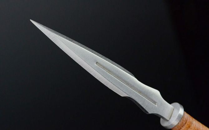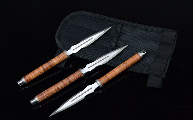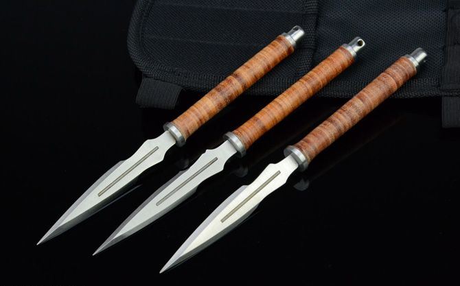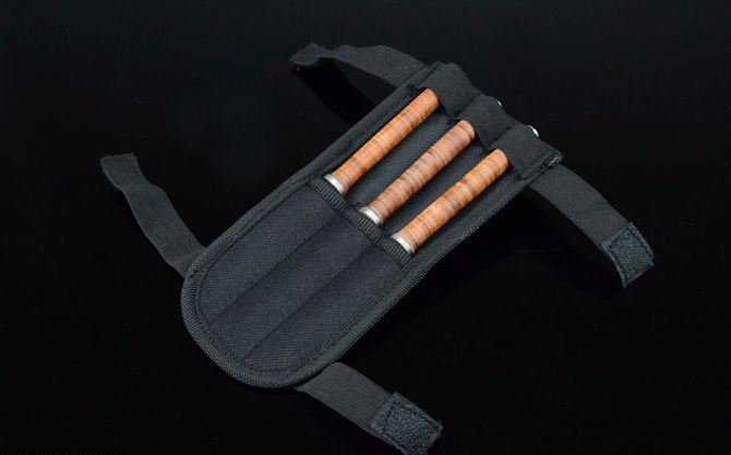 皮缨枪飞镖(3支装) 全长:16.7cm 刃厚:2.8cm 刃宽:1.2cm 刃长:8cm 表面:砂光 材料:440 柄长:8.5cm 柄材:高压绑皮 总重:112g(带尼龙刀套) 备注:3支装
