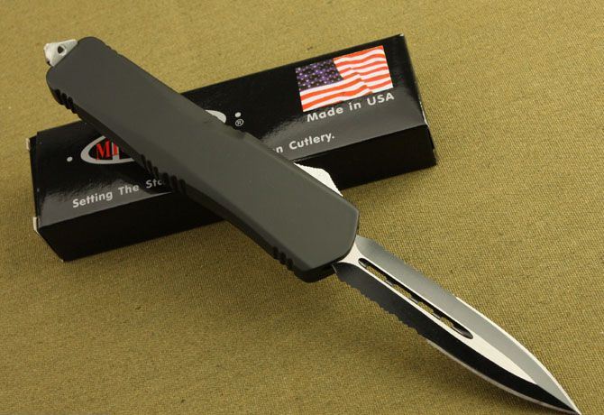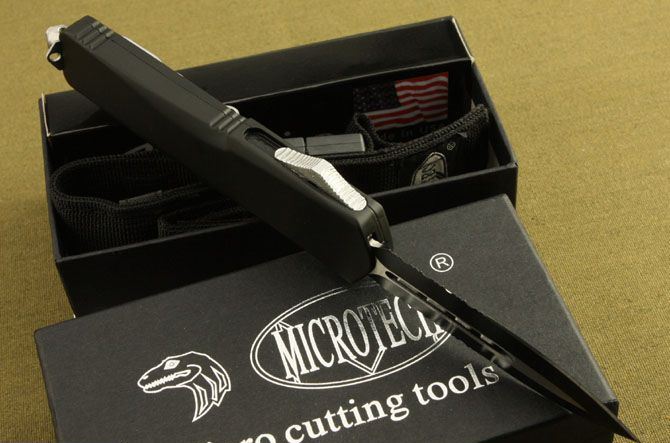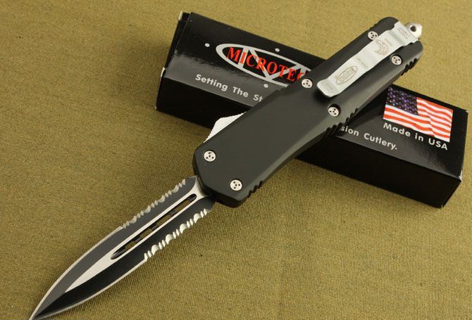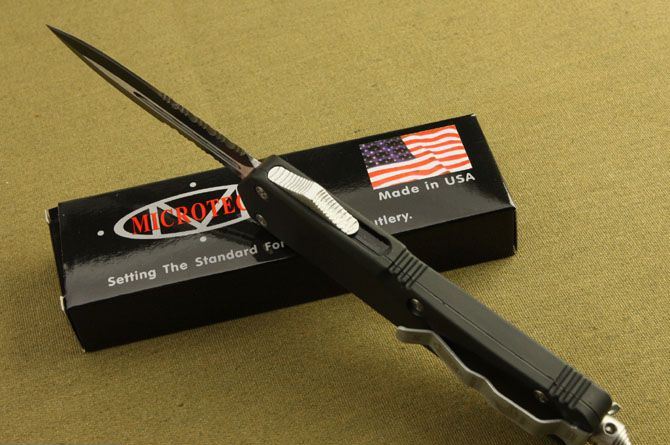新版微技术伤齿龙双锋半齿 全 长: 23cm 刃 长: 9cm 刃 厚: 2.8mm 刃 材: 440 硬 度: 57HRC 刀 重: 220g 毛 重: 340g 表 面: 氧化黑 柄 材: 锌铝合金 刀 鞘: 尼龙 锁 闭: 直出弹簧刀