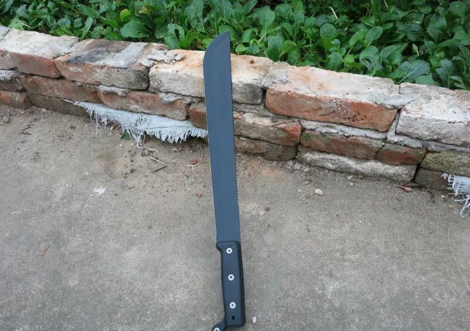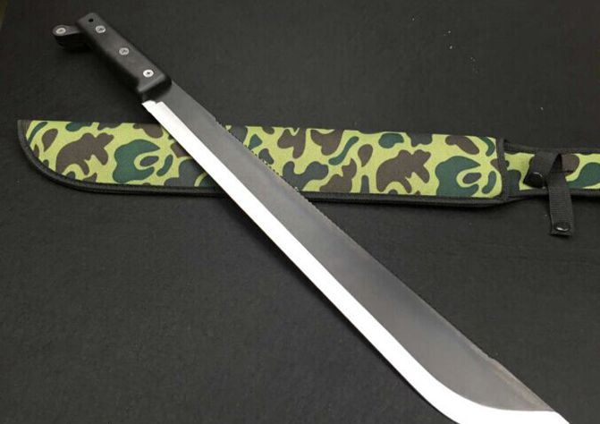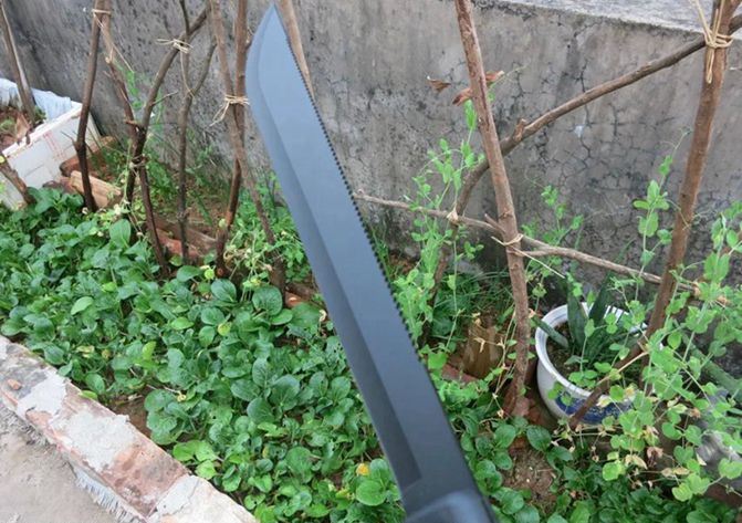 全 长:54CM 刃 长:42CM 刃 厚:3.5MM 刃 材:420不锈钢 硬 度:57HRC 重 量:580g 表 面:电泳 柄 材:ABS 刀 鞘:尼龙 种 类:黑白刃和全黑(购买时请注明种类)