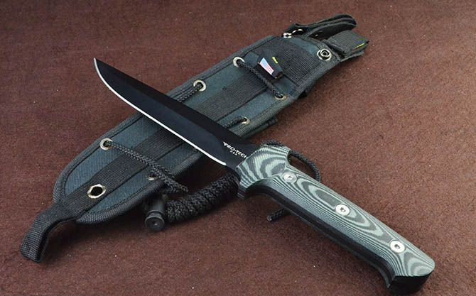 全长:32.5cm 刃长:17cm 柄长:14.8cm 刃厚:4.8mm 刃宽: 3.5cm 刃材: 7Cr17Mov 表面:黑钛 柄材: 绿黑纹G10 硬度: 58HRC 毛重:600克(含包装) 包装:纸盒、尼龙套,说明书