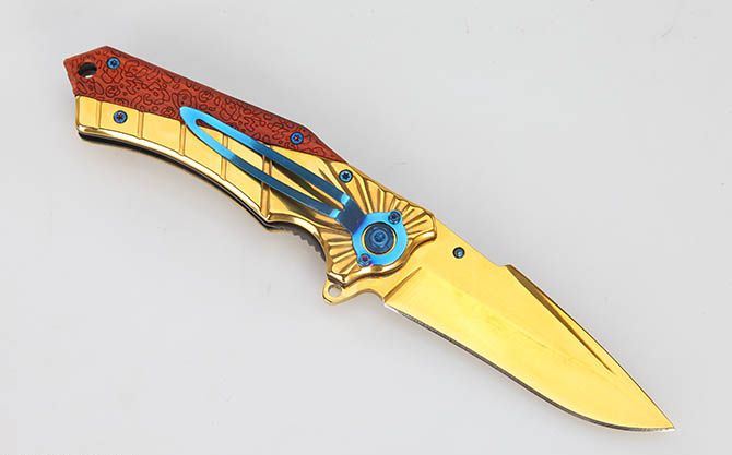 勃朗宁368金镜光快开折刀 全 长:20.5cm 刃 长:9cm 柄 长:12cm 刃 宽:3cm 刃 厚:3.4mm 刃 材:3Cr13Mov 重 量:220g(含包装) 硬 度:56HRC 表 面:金镜光 柄 材:金镜光全钢+彩木雕花柄片 锁 型:线锁 包 装:彩盒 备 注:带腰夹