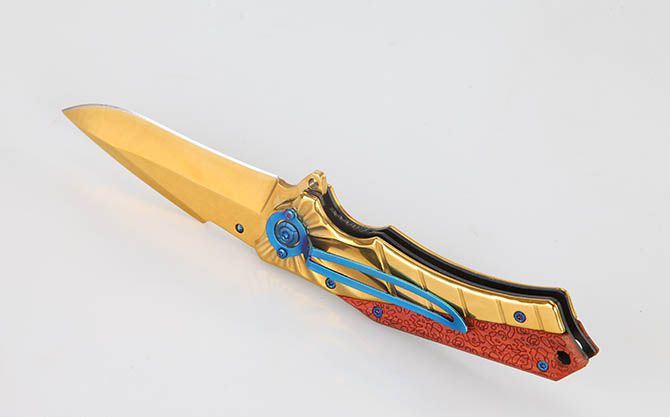 全 长:20.5cm 刃 长:9cm 柄 长:12cm 刃 宽:3cm 刃 厚:3.4mm 刃 材:3Cr13Mov 重 量:220g(含包装) 硬 度:56HRC 表 面:金镜光 柄 材:金镜光全钢+彩木雕花柄片 锁 型:线锁 包 装:彩盒 备 注:带腰夹