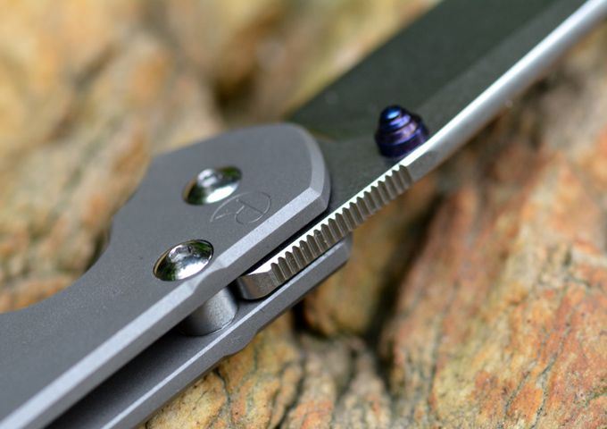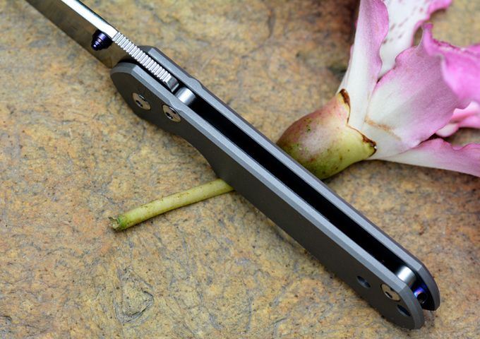 随风版CR小沙折刀 全长:174mm 折合:101mm 刃长:74mm 刃宽:22mm 刃厚:3mm 柄厚:10mm 重量:130g 刃材:德国D2 硬度:59-61HRC 刃面:石洗 柄材:日本进口钛合金TC4(表面喷砂处理) 定位珠:德国FAG陶瓷定位珠 刀夹:弹簧钢特制 所有轴件440不锈钢硬度HRC50 所有螺丝420不锈钢硬度HRC45 钛合金锁定面做热处理硬度HRC43 黄铜垫片,精密铜油槽轴套设计,可有效增加开合顺滑度