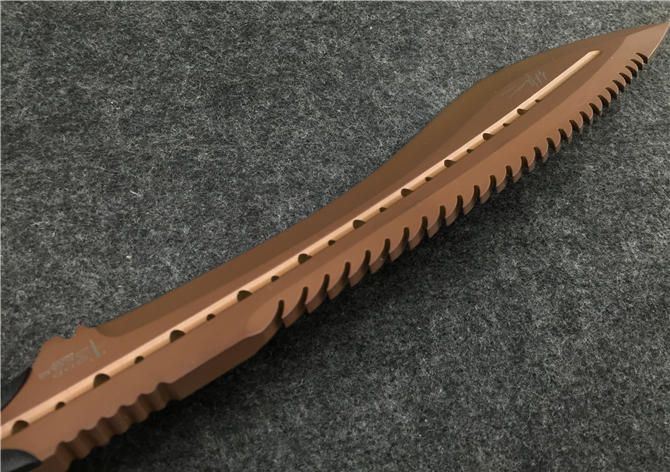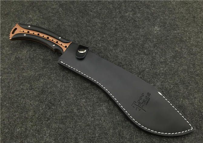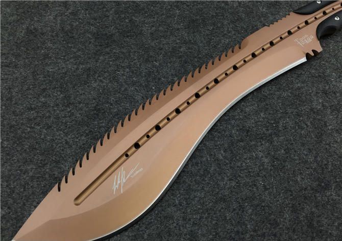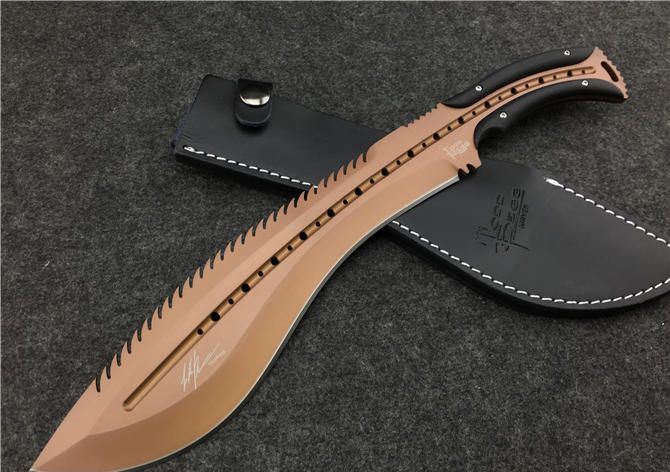 托德·贝格—恶龙狗腿(咖啡金手工版) 全 长:355mm 刃 长:23mm 柄 长:120mm 刃最宽:55mm 刃 厚:6mm 刃 材:8cr18mov 重 量:560g(含包装) 硬 度:59HRC 表 面:镀咖啡金 柄 材:钢一体柄+G10条 锁 型:定锁 其 他:配牛皮套