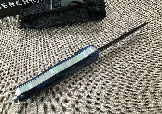 全 长: 23cm 刃 长: 9.6cm 刃 厚: 2.8mm 刃 材: 440 硬 度: 57HRC 刀 重: 201g 毛 重: 277g 表 面: 氧化黑 柄 材: 锌铝合金+树脂 刀 鞘: 尼龙 锁 闭: 直出弹簧刀
