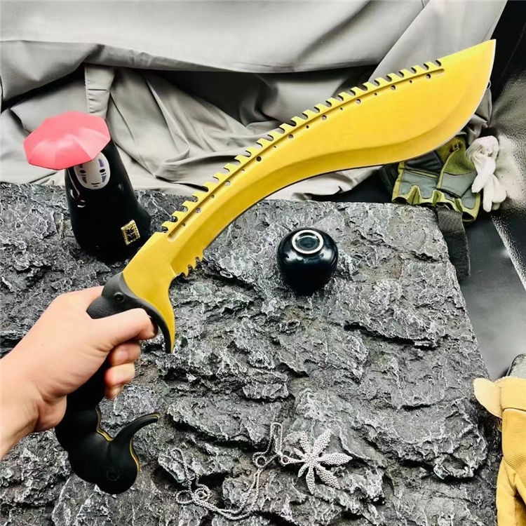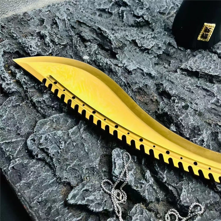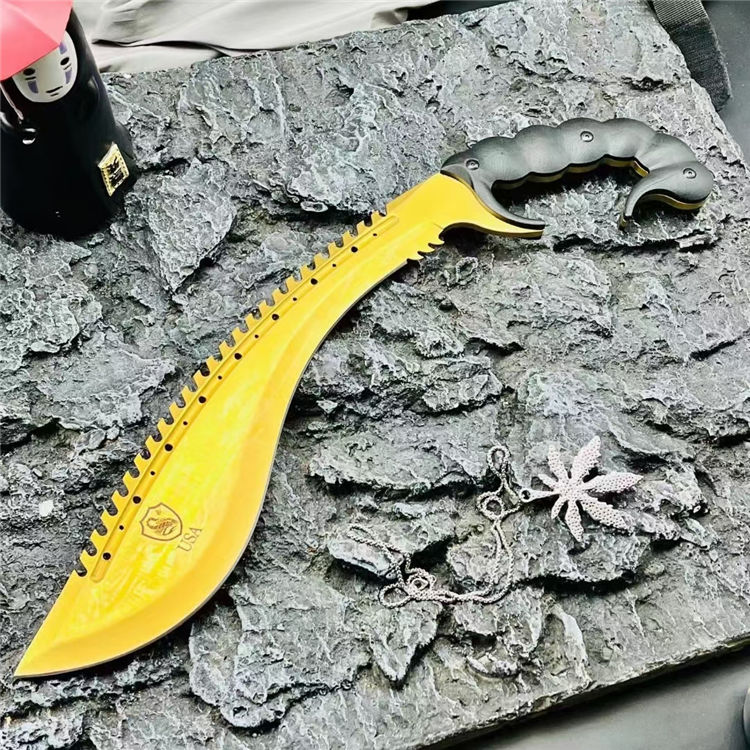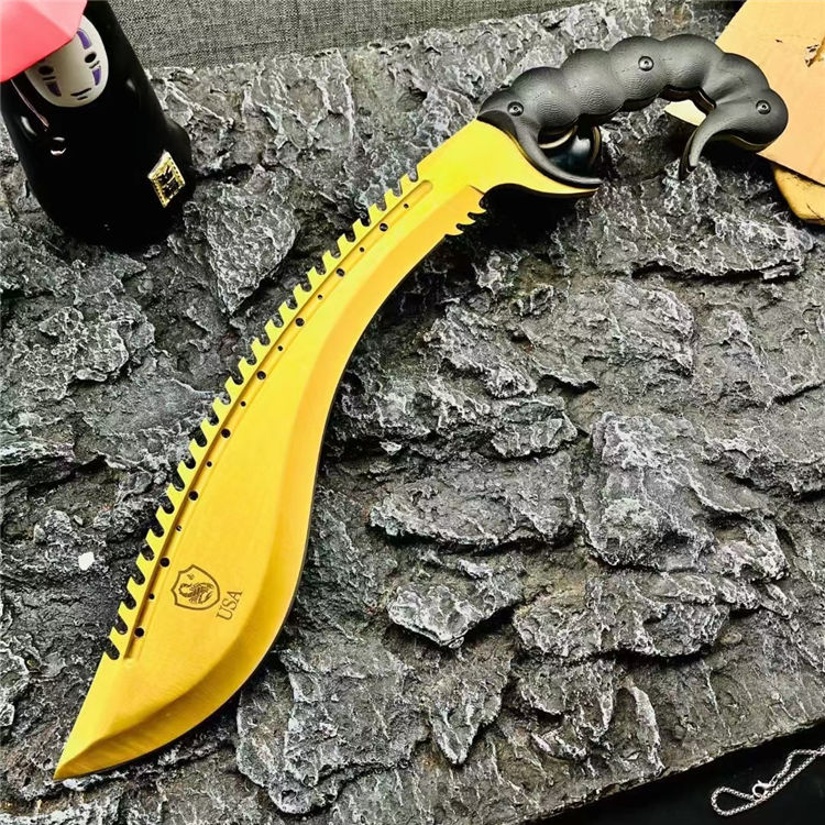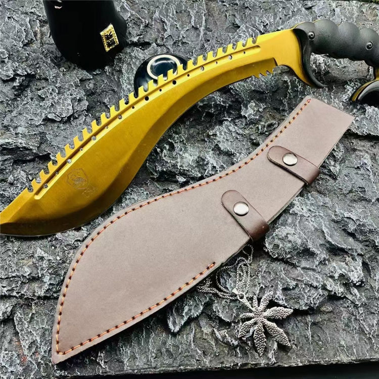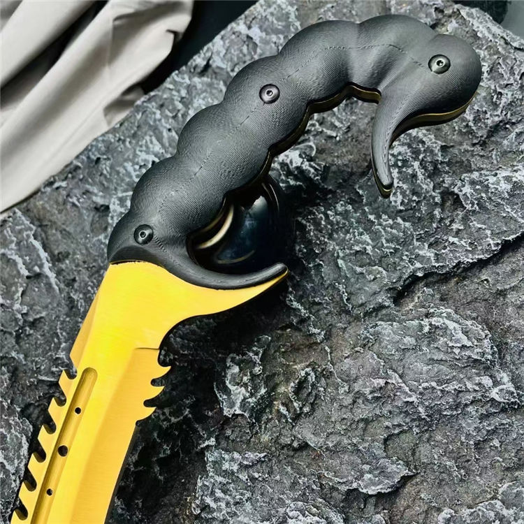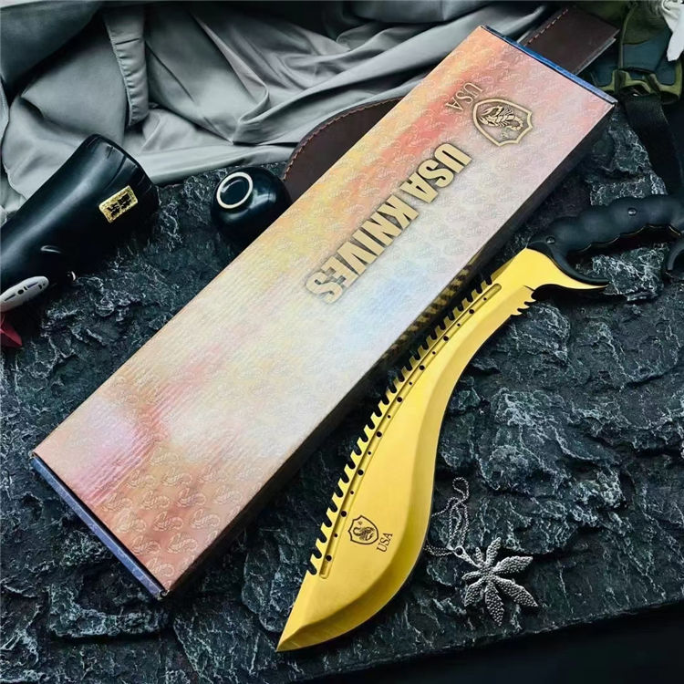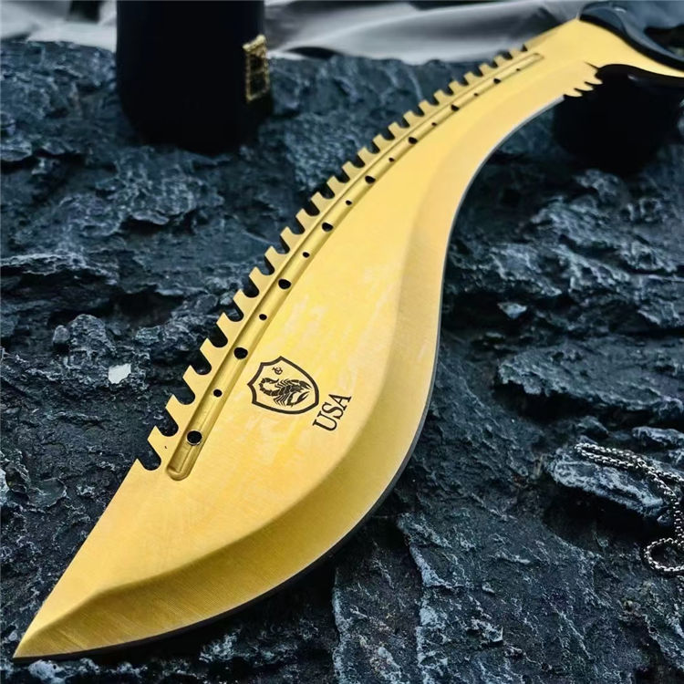 黄金蝎子战斗狗腿刀(皮套) 全 长:470mm 刃 长:300mm 柄 长:170mm 刃 最宽:70mm 刃 厚:6mm 刃 材:8cr18mov 净 重:1000克 毛 重:1500克(含包装) 硬 度:59HRC 表 面:拉丝+镀钛金 柄 材:钢一体柄+G10柄 锁 型:定锁 其 他:皮套