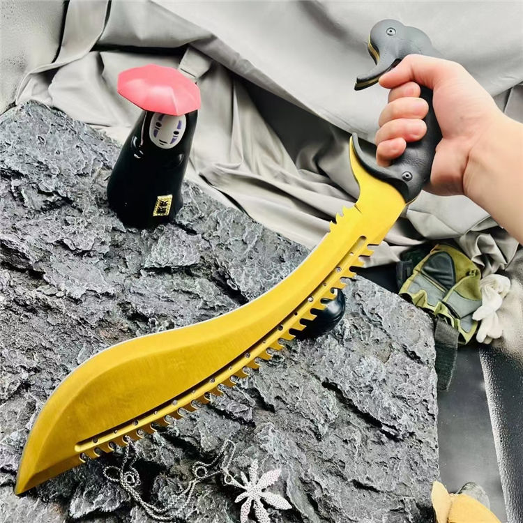 全 长:470mm 刃 长:300mm 柄 长:170mm 刃 最宽:70mm 刃 厚:6mm 刃 材:8cr18mov 净 重:1000克 毛 重:1500克(含包装) 硬 度:59HRC 表 面:拉丝+镀钛金 柄 材:钢一体柄+G10柄 锁 型:定锁 其 他:皮套
