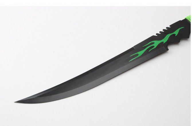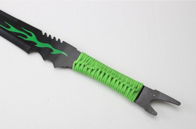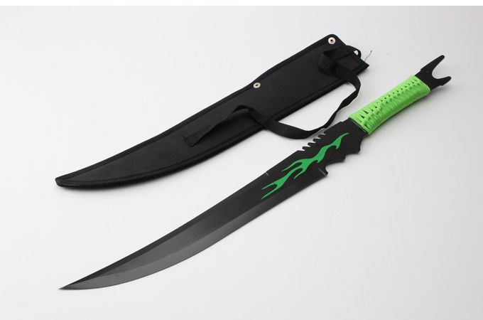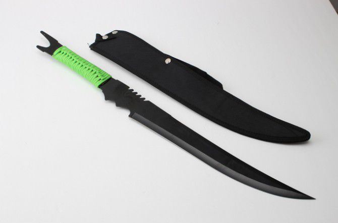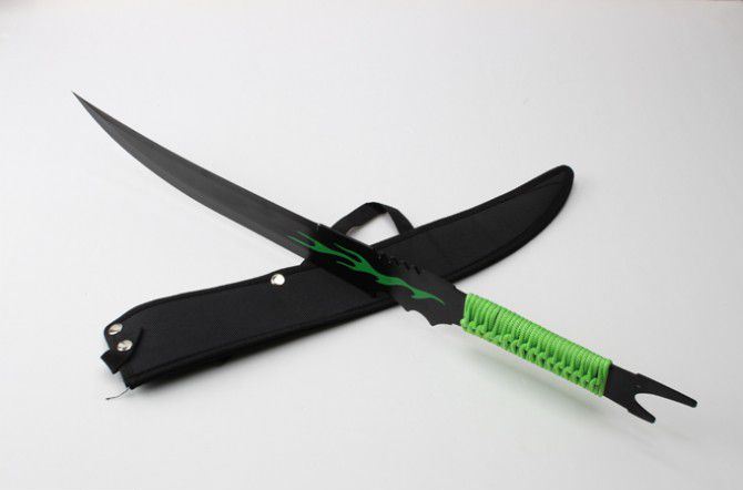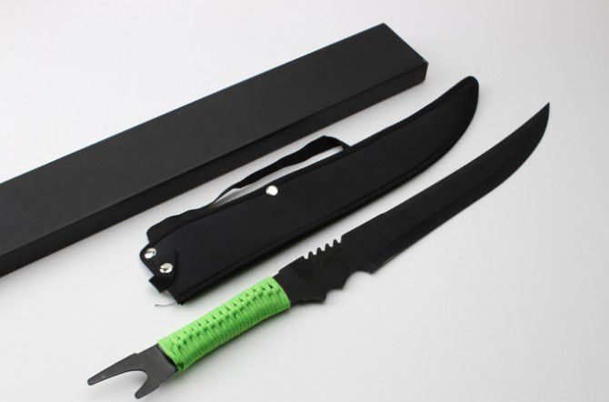 全长:63cm 刃长:35cm 柄长:22cm 刃厚:2.8mm 表面:氧化镀色 刃材:440 硬度:57HRC 刀柄:绑绳 重量:570g 备注:带尼龙刀套 包装:硬纸盒