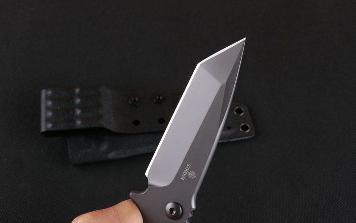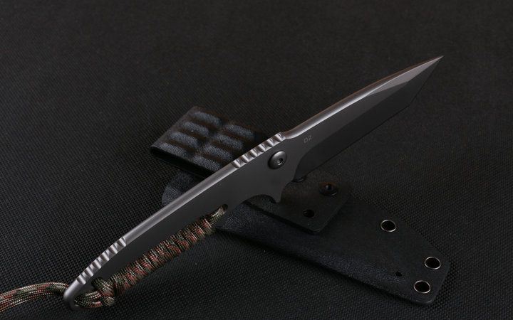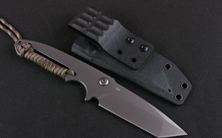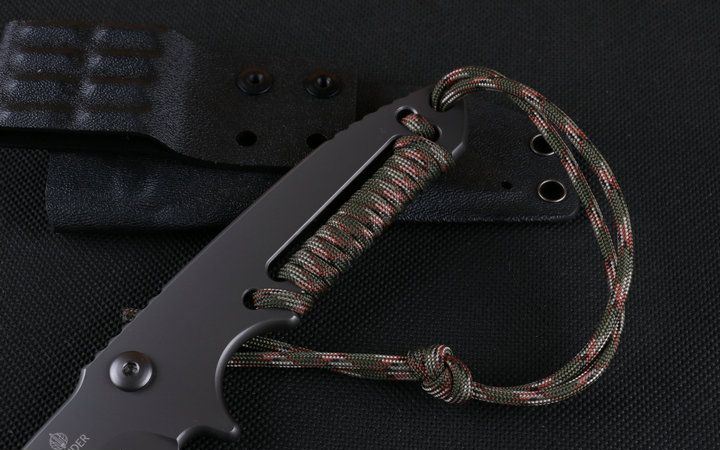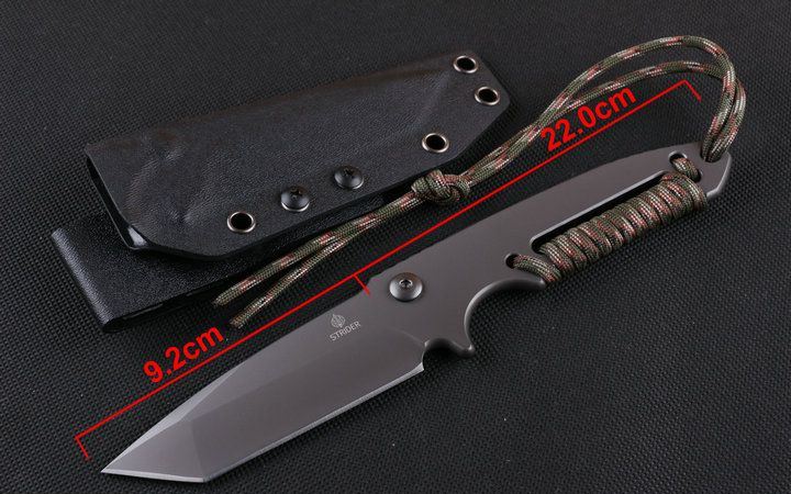 全 长:22.0cm 刃 长:10.0cm 柄 长:12.0cm 刃 宽:3.3cm(最宽处) 刃 厚:5.7mm 刃 材:纯正D2钢.真空深冷处理 硬 度: 58-61HRC 刀 柄:一体D2钢龙骨,圈1.2米高品种求生绳 表 面:镀钛 结 构:一体龙骨 刀 重:200克 总 重: 400克 备 注:带高强度K鞘