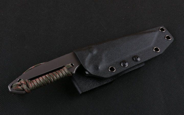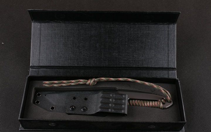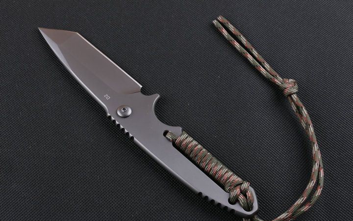 挺进者美军特击队战刀 全 长:22.0cm 刃 长:10.0cm 柄 长:12.0cm 刃 宽:3.3cm(最宽处) 刃 厚:5.7mm 刃 材:纯正D2钢.真空深冷处理 硬 度: 58-61HRC 刀 柄:一体D2钢龙骨,圈1.2米高品种求生绳 表 面:镀钛 结 构:一体龙骨 刀 重:200克 总 重: 400克 备 注:带高强度K鞘