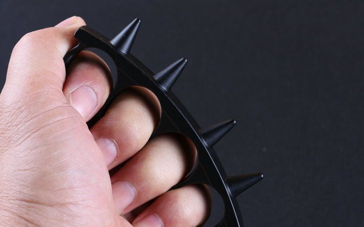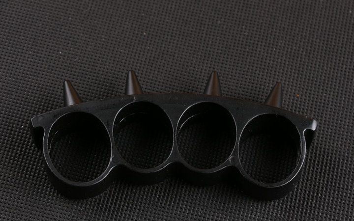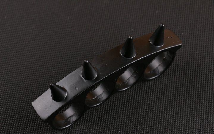 尖刺四指拳套(黑色) 规格:长10.5*高4.6*厚1.6CM 材质:铸铁金属 重量:150克 戴上后可提升拳部的攻击力,而其用于格斗时套在手上,可以使拳头的威力暴增,只要用于自防卫,打破汽车玻璃自救等