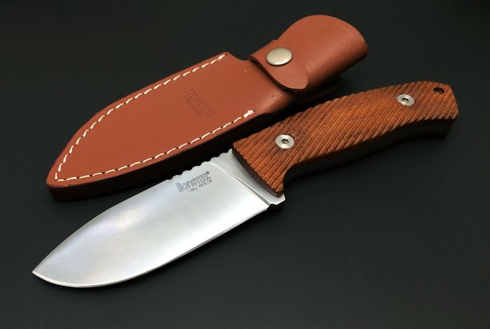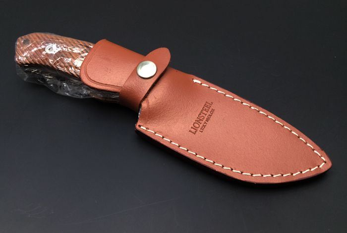 LionSteel意大利钢狮直刀 全长:23.5 cm 刃长:10.6 cm 刃厚:4.5mm 刃宽:3.9cm 刀刃钢材:5Cr15Mov 钢材硬度:57-58 HRC 手柄材质:酸枝木手柄,3D立体雕刻防滑纹路 表面处理:砂光 重量:345克(含刀鞘) 刀鞘材质:皮鞘