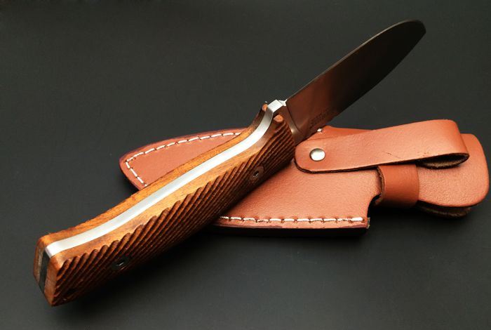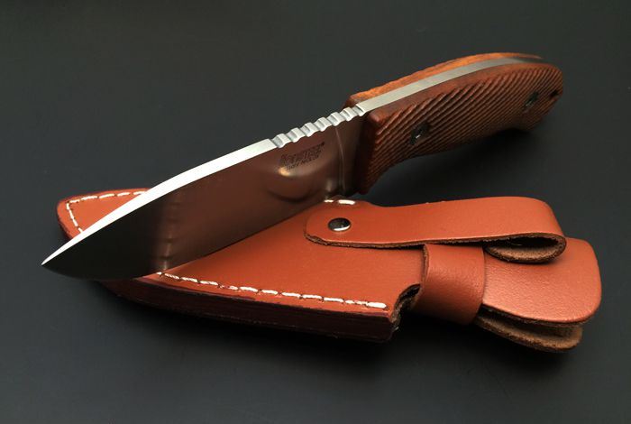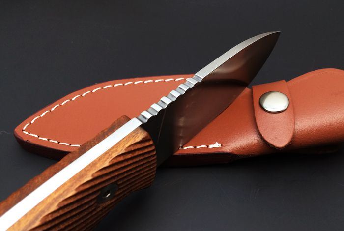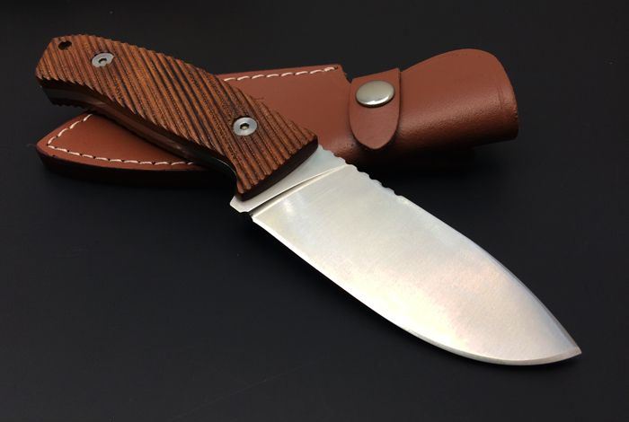 全长:23.5 cm 刃长:10.6 cm 刃厚:4.5mm 刃宽:3.9cm 刀刃钢材:5Cr15Mov 钢材硬度:57-58 HRC 手柄材质:酸枝木手柄,3D立体雕刻防滑纹路 表面处理:砂光 重量:345克(含刀鞘) 刀鞘材质:皮鞘