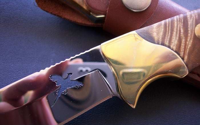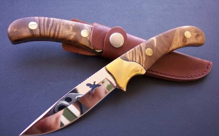 勃朗宁经典随身护卫刀 全长:21.5 刃长:9.5 刃厚:0.32 硬度:58 表面:镜光 柄长:12 柄材:一体龙骨,黄铜+影木 重量: 260克(含鞘) 牛皮刀鞘