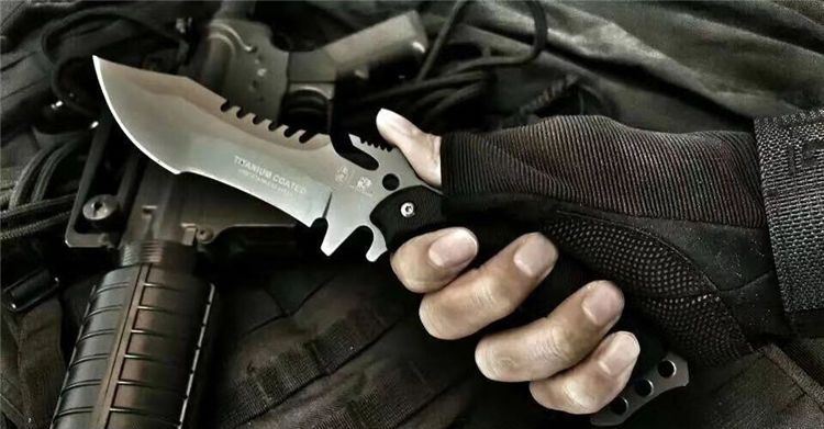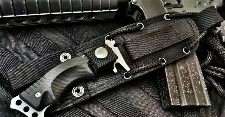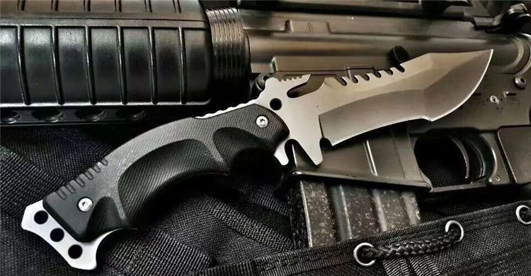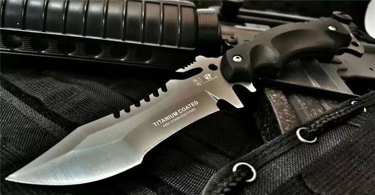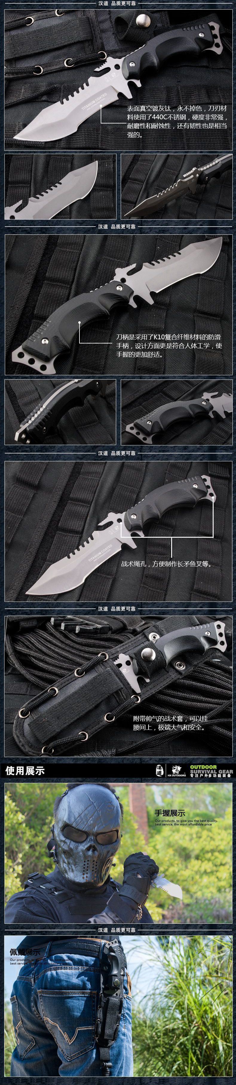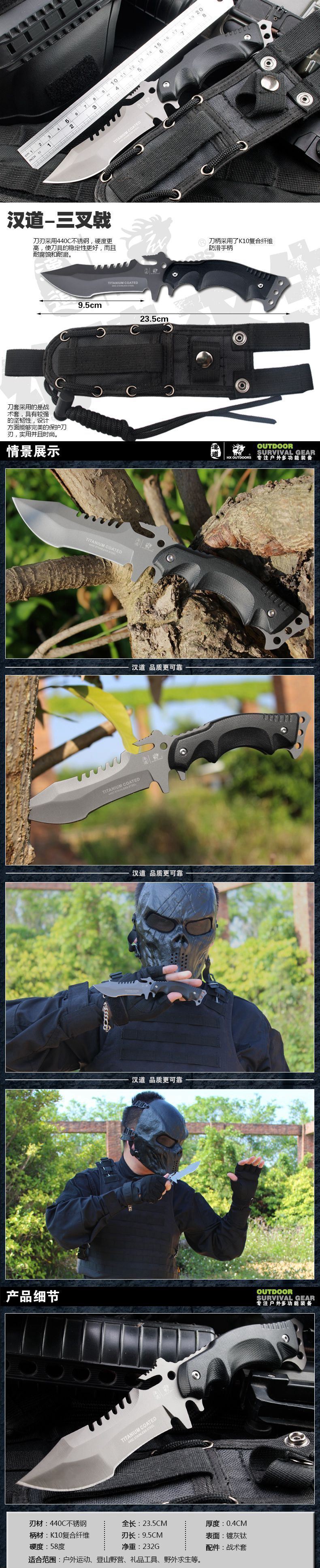 全 长:23.5CM 刃 长:9.5CM 刃 厚:0.4CM 表 面:镀灰钛 刃 材:440C不锈钢 手 柄:K10复合纤维防滑手柄 硬 度:58HRC 重 量:232g 配 件:战术套