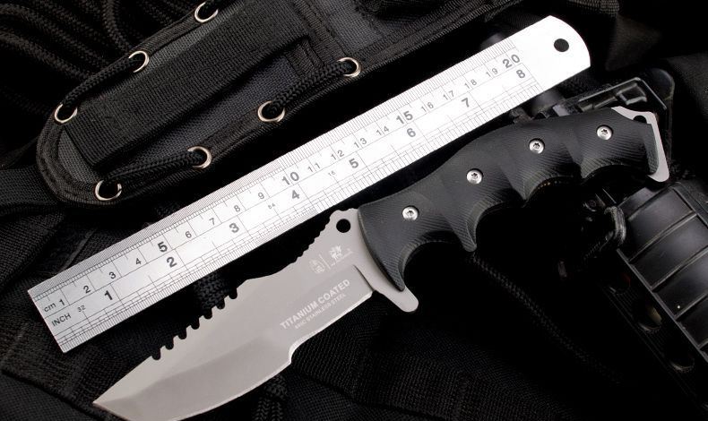 全长:22.5CM 刃长:9.5CM 刃厚:0.4CM 表面:镀灰钛 刃材:440C不锈钢 硬度:58HRC 手柄:K10复合纤维防滑手柄 重量:200g 配件:战术套